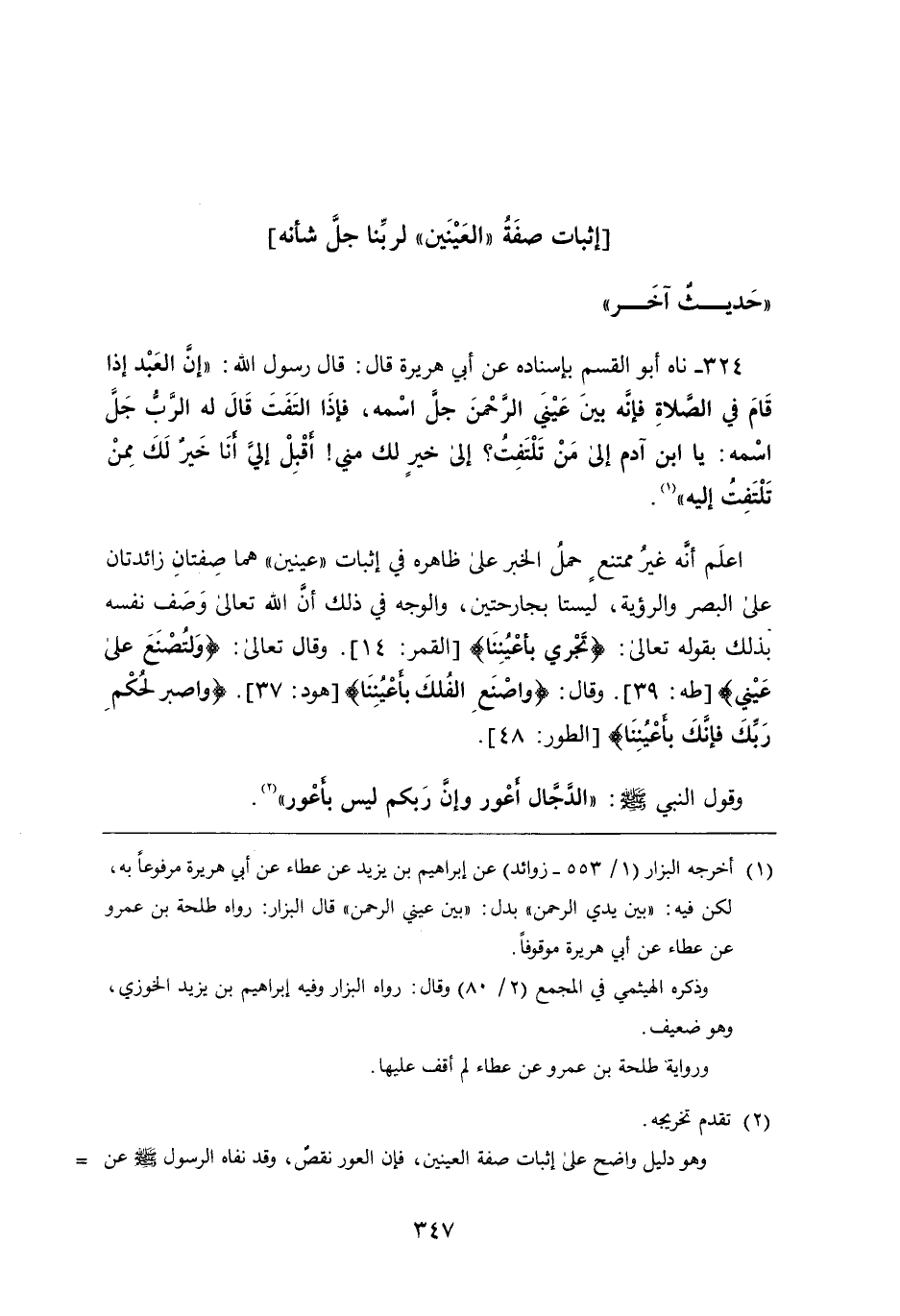 324 - ناه أَبُو القسم بِإِسْنَادِهِ، عَن أَبِي هريرة قَالَ: قَالَ رَسُول اللَّهِ صَلَّى اللَّهُ عَلَيْهِ وَسَلَّمَ: " إن العبد إِذَا قام فِي الصلاة فإنه بين عيني الرَّحْمَنِ جل اسمه، فإذا التفت قَالَ لَهُ الرب جل اسمه: يَا ابن آدم إِلَى من تلتفت؟ إِلَى خير لك مني أقبل إلي أنا خير لك ممن تلتفت إِلَيْهِ " اعلم أَنَّهُ غير ممتنع حمل الخبر عَلَى ظاهره فِي إثبات عينين هما صفتان زائدتان عَلَى البصر والرؤية، ليستا بجارحتين، والوجه فِي ذلك أن اللَّه تَعَالَى وصف نفسه بذلك بقوله تَعَالَى: {تَجْرِي بِأَعْيُنِنَا} وَقَالَ تَعَالَى: {وَلِتُصْنَعَ عَلَى عَيْنِي} وَقَالَ: {وَاصْنَعِ الْفُلْكَ بِأَعْيُنِنَا} {وَاصْبِرْ لِحُكْمِ رَبِّكَ فَإِنَّكَ بِأَعْيُنِنَا} وقول النبي صَلَّى اللَّهُ عَلَيْهِ وَسَلَّمَ: " الدجال أعور وإن ربكم ليس بأعور "