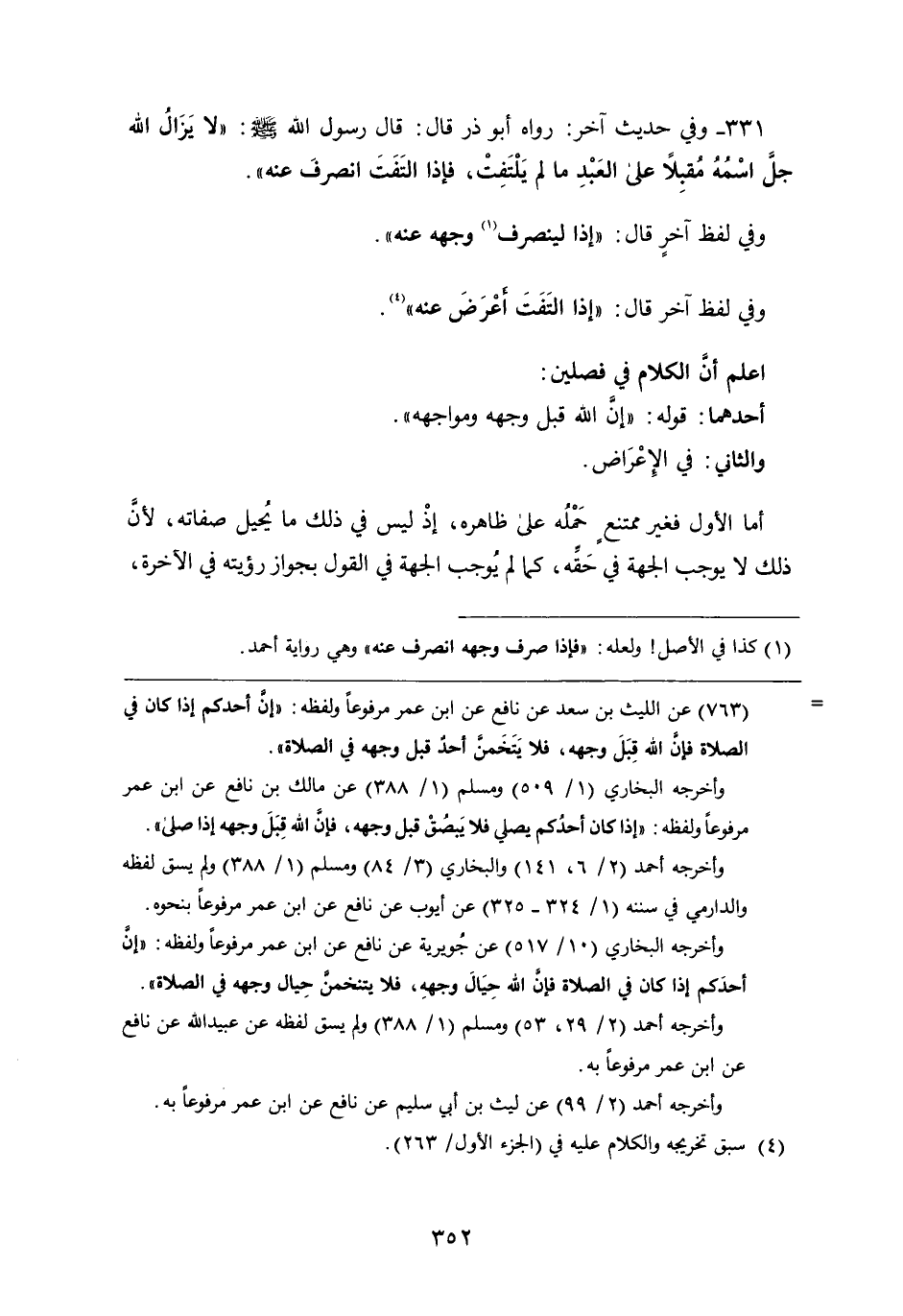 331 - وَفِي حديث آخر: رَوَاهُ أَبُو ذر قَالَ: قَالَ رَسُول اللَّهِ صَلَّى اللَّهُ عَلَيْهِ وَسَلَّمَ: " لا يزال اللَّه جل اسمه مقبلا عَلَى العبد مَا لَمْ يلتفت، فإذا التفت انصرف عَنْهُ " وَفِي لَفْظٍ آخَرَ قَالَ: " إِذَا لينصرف وجهه عَنْهُ " وَفِي لَفْظٍ آخَرَ قَالَ: " إِذَا التفت أعرض عَنْهُ " اعلم أن الكلام فِي فصلين: أحدهما: قوله: " إن اللَّه قبل وجهه ومواجهه " والثاني: فِي الإعراض أما الأول فغير ممتنع حمله عَلَى ظاهره، إذ ليس فِي ذلك مَا يحيل صفاته، لأَنَّ ذلك لا يوجب الجهة فِي حقه، كَمَا لَمْ يوجب الجهة فِي القول بجواز رؤيته فِي الآخرة،