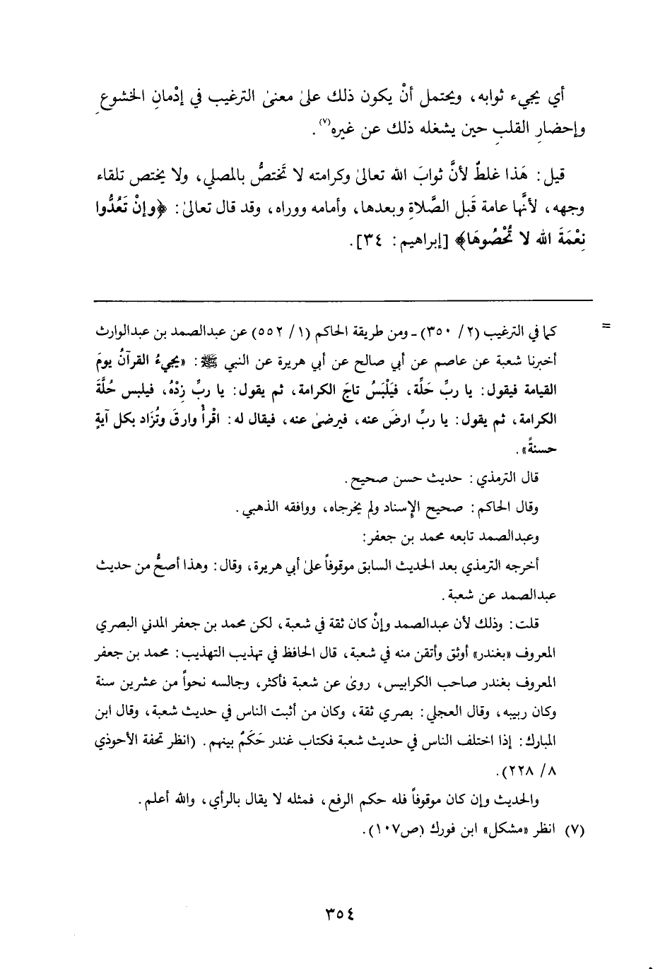أي: يجيء ثوابه، ويحتمل أَنْ يَكُونَ ذلك عَلَى مَعْنَى الترغيب فِي إدمان الخشوع وإحضار القلب حين يشغله ذلك عَن غيره قيل: هَذَا غلط لأَنَّ ثواب اللَّه تَعَالَى وكرامته لا تختص بالمصلي، وَلا يختص تلقاء وجهه، لأنها عامة قبل الصلاة وبعدها، وأمامه ووراه، وقد قَالَ تَعَالَى: {وَإِنْ تَعُدُّوا نِعْمَتَ اللَّهِ لا تُحْصُوهَا}