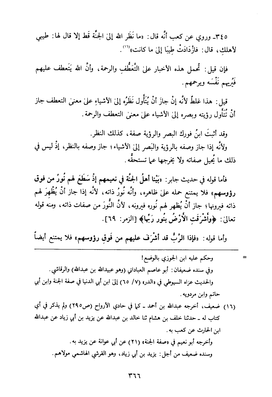 345 - وروي عَن كعب أَنَّهُ قَالَ: " مَا نظر اللَّه إِلَى الجنة قط إِلا قَالَ لَهَا: طيبي لأهلك، قَالَ: فازدادت طيبا إِلَى مَا كانت " فإن قِيلَ: تحمل هَذِهِ الأخبار عَلَى التعطف والرحمة، وأن اللَّه يتعطف عليهم فيريهم نفسه ويرحمهم قيل: هَذَا غلط لأَنَّهُ إن جاز أن يتأول نظره إِلَى الأشياء عَلَى مَعْنَى التعطف جاز أن تتأول رؤيته وبصره إِلَى الأشياء عَلَى مَعْنَى التعطف والرحمة وقد أثبت ابن فورك البصر والرؤية صفة، كذلك النظر ولأنه إِذَا جاز وصفه بالرؤية والبصر إِلَى الأشياء جاز وصفه بالنظر، إذ ليس فِي ذلك مَا يحيل صفاته وَلا يخرجها عما تستحقه فأما قوله فِي حديث جابر: " بينا أهل الجنة فِي نعيمهم إذ سطع لهم نور من فوق رؤوسهم " فلا يمتنع حمله عَلَى ظاهره، وأنه نور ذاته، لأَنَّهُ إِذَا جاز أن يظهر لهم ذاته فيرونها جاز أن يظهر لهم نوره فيرونه، لأَنَّ النور من صفات ذاته، وَمِنْهُ قوله تَعَالَى: {وَأَشْرَقَتِ الأَرْضُ بِنُورِ رَبِّهَا} وأما قوله: " فإذا الرب قد أشرف عليهم من فوق رؤوسهم " فلا يمتنع أَيْضًا