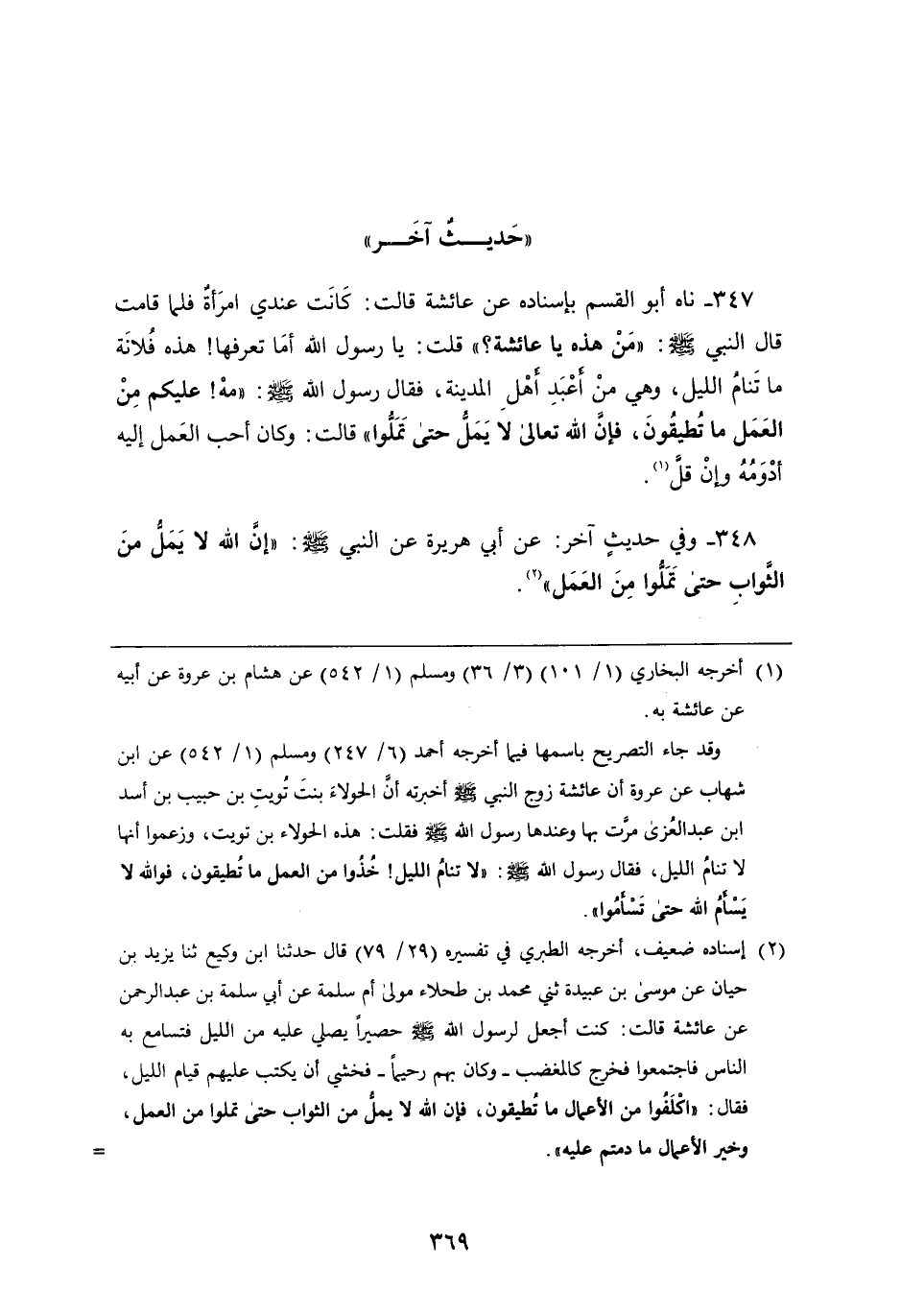 347 - ناه أَبُو القسم بِإِسْنَادِهِ، عَن عائشة قالت: كانت عندي امرأة فلما قامت قَالَ النبي صَلَّى اللَّهُ عَلَيْهِ وَسَلَّمَ: " من هَذِهِ يَا عائشة "؟ قلت: يَا رَسُول اللَّهِ أما تعرفها هَذِهِ فلانة مَا تنام الليل، وهي من أعبد أهل المدينة، فَقَالَ رَسُول اللَّهِ صَلَّى اللَّهُ عَلَيْهِ وَسَلَّمَ: " مه عليكم من العمل مَا تطيقون، فإن اللَّه تَعَالَى لا يمل حتى تملوا " قالت: وكان أحب العمل إِلَيْهِ أدومه وإن قل
