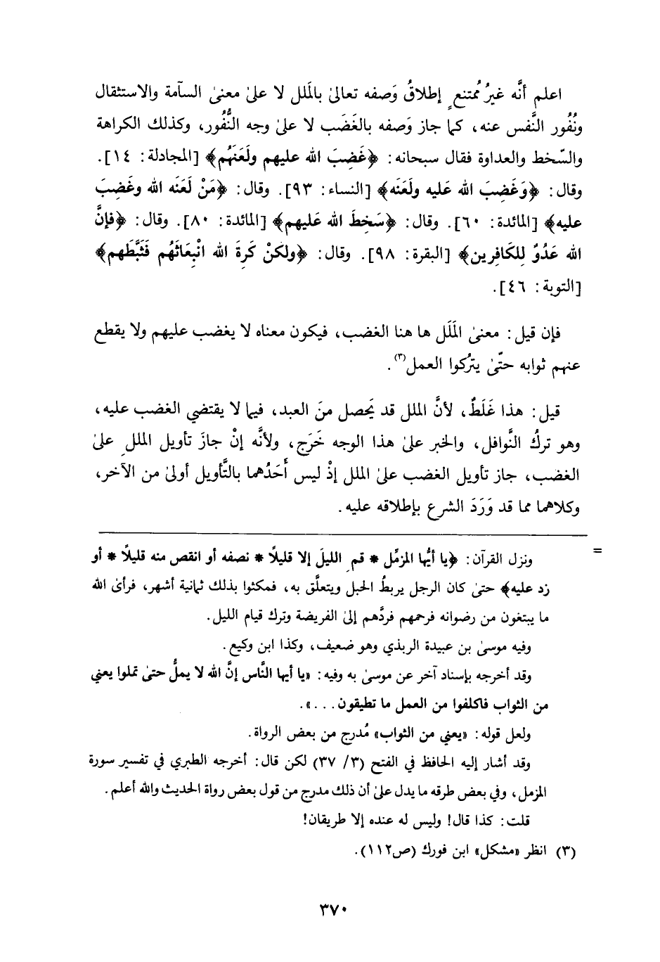 اعلم أَنَّهُ غير ممتنع إطلاق وصفه تَعَالَى بالملل لا عَلَى مَعْنَى السآمة والاستثقال ونفور النفس عَنْهُ، كَمَا جاز وصفه بالغضب لا عَلَى وجه النفور، وكذلك الكراهة والسخط والعداوة، فَقَالَ سُبْحَانَهُ: {وَغَضِبَ اللَّهُ عَلَيْهِمْ وَلَعَنَهُمْ} وقال: {وَغَضِبَ اللَّهُ عَلَيْهِ وَلَعَنَهُ} وَقَالَ: {مَنْ لَعَنَهُ اللَّهُ وَغَضِبَ عَلَيْهِ} وَقَالَ: {سَخِطَ اللَّهُ عَلَيْهِمْ} وَقَالَ: {فَإِنَّ اللَّهَ عَدُوٌّ لِلْكَافِرِينَ} وَقَالَ: {وَلَكِنْ كَرِهَ اللَّهُ انْبِعَاثَهُمْ فَثَبَّطَهُمْ} فإن قِيلَ: مَعْنَى الملل ها هنا الغضب، فيكون معناه لا يغضب عليهم وَلا يقطع عنهم ثوابه حتى يتركوا العمل قيل: هَذَا غلط، لأَنَّ الملل قد يحصل من العبد، فيما لا يقتضي الغضب عَلَيْهِ، وَهُوَ ترك النوافل، والخبر عَلَى هَذَا الوجه خرج، ولأنه إن جاز تأويل الملل عَلَى الغضب، جاز تأويل الغضب عَلَى الملل إذ ليس أحدهما بالتأويل أولى من الآخر، وكلاهما مما قد ورد الشرع بإطلاقه عَلَيْه