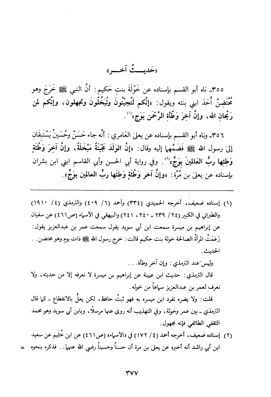 355 - ناه أَبُو القسم بِإِسْنَادِهِ، عَن خولة بنت حكيم، أَنَّ النَّبِيَّ صَلَّى اللَّهُ عَلَيْهِ وَسَلَّمَ خرج وَهُوَ محتضن أحد ابني بنته ويقول: " إنكم لتجبنون وتبخلون وتجهلون، وإنكم لمن ريحان اللَّه، وإن آخر وطأة الرَّحْمَنِ بوج "