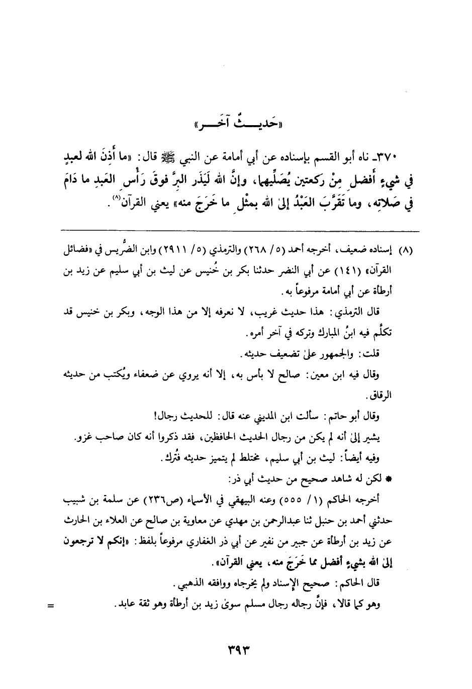 370 - ناه أَبُو القسم بِإِسْنَادِهِ، عَن أَبِي أمامة، عَنِ النَّبِيِّ صَلَّى اللَّهُ عَلَيْهِ وَسَلَّمَ قَالَ: " مَا أذن اللَّه لعبد فِي شيء أفضل من ركعتين يصليهما، وإن اللَّه ليذر البر فوق رأس العبد مَا دام فِي صلاته، وما تقرب العبد إِلَى اللَّه بمثل مَا خرج مِنْهُ " يَعْنِي القرآن