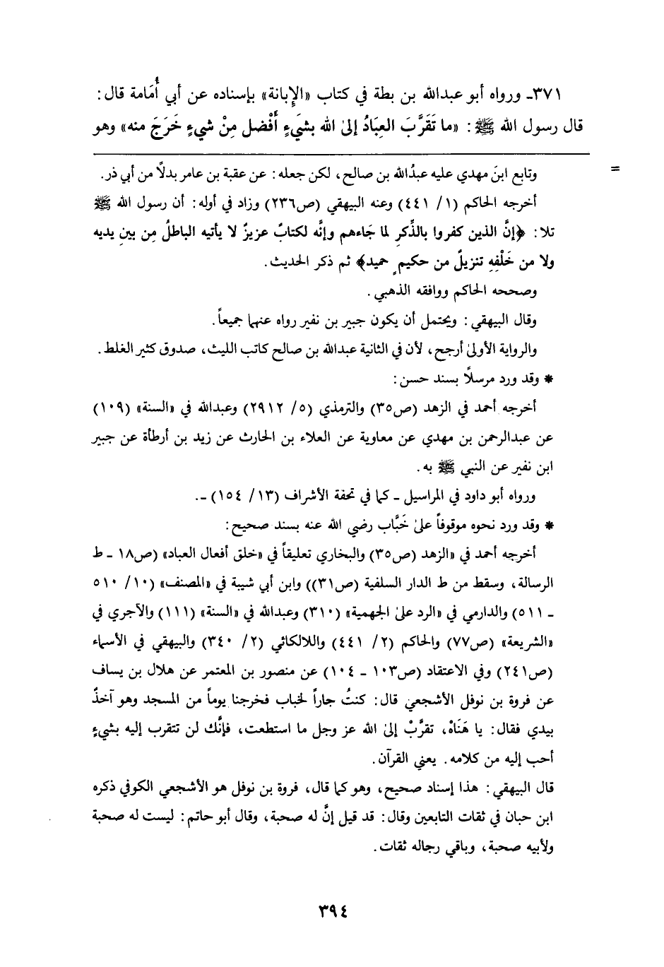 371 - ورواه أَبُو عبد اللَّه بْن بطة فِي كتاب الإبانة بِإِسْنَادِهِ، عَن أَبِي أمامة قَالَ: قَالَ رَسُول اللَّهِ صَلَّى اللَّهُ عَلَيْهِ وَسَلَّمَ: " مَا تقرب العباد إِلَى اللَّه بشيء أفضل من شيء خرج مِنْهُ " وَهُوَ
