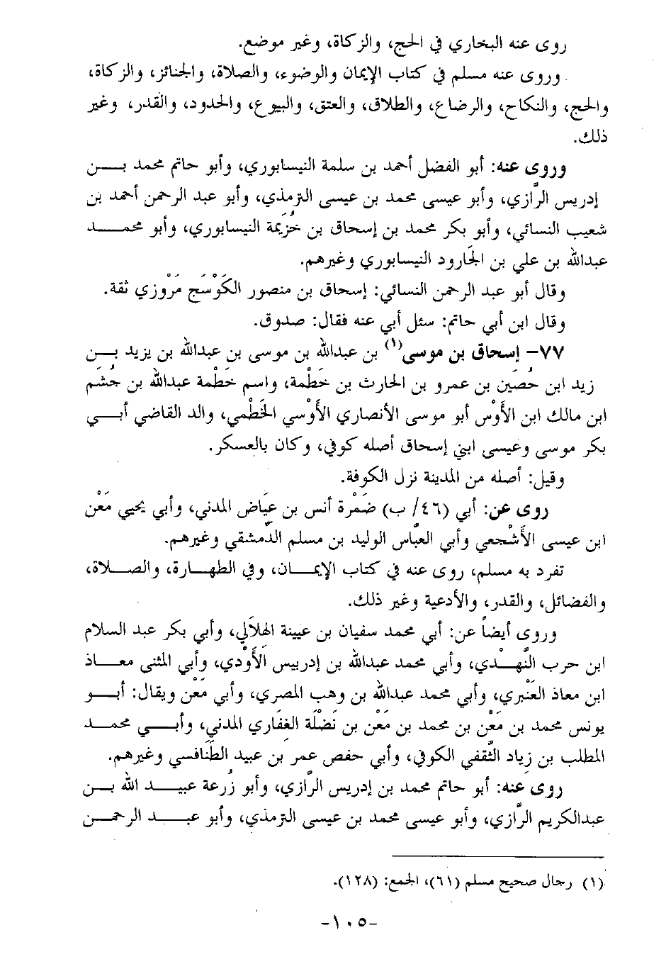 77 - إسحاق بن موسى بن عبد الله بن موسى بن عبد الله بن يزيد بن زيد ابن حصين بن عمرو بن الحارث بن خطمة، واسم خطمة عبد الله بن جشم ابن مالك ابن الأوس أبو موسى الأنصاري الأوسي الخطمي، والد القاضي أبي بكر موسى وعيسى ابني إسحاق أصله كوفي، وكان بالعسكر.
