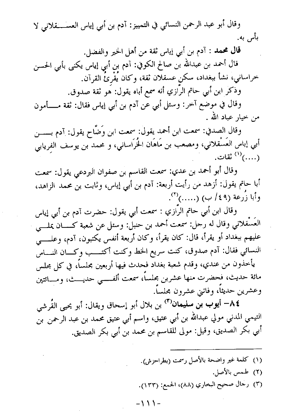 وقال أبو عبد الرحمن النسائي في التمييز: آدم بن أبي إياس العسقلاني لا بأس به.