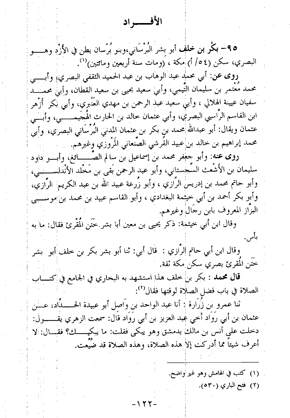 95 - بكر بن خلف أبو بشر البرساني، وبنو برسان بطن في الأزد وهو البصري، سكن مكة، (ومات سنة أربعين ومائتين).