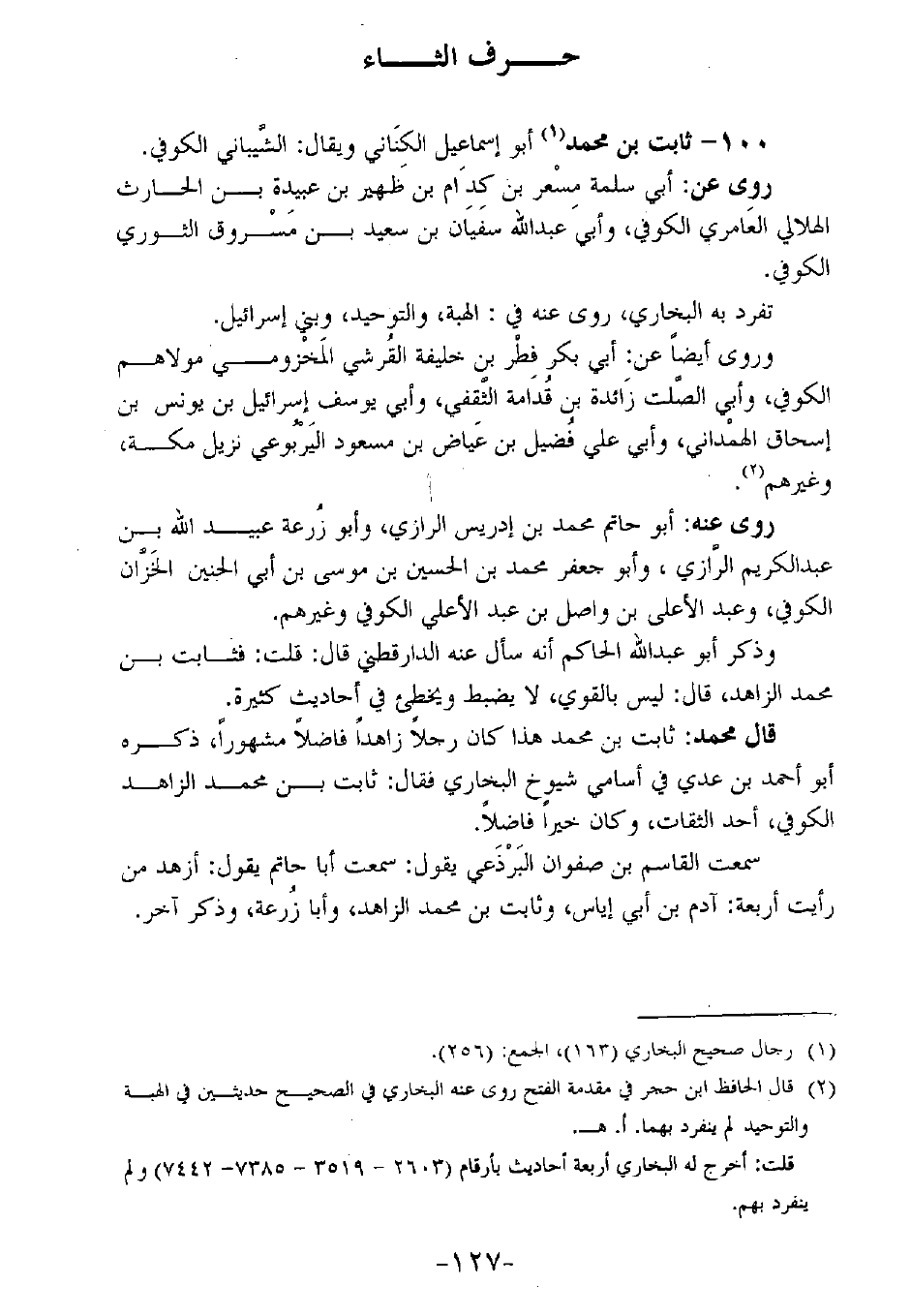 قال محمد: ثابت بن محمد هذا كان رجلاً زاهدًا فاضلاً مشهورًا، ذكره أبو أحمد بن عدي في أسامي شيوخ البخاري فقال: ثابت بن محمد الزاهد الكوفي، أحد الثقات، وكان خيرًا فاضلاً.