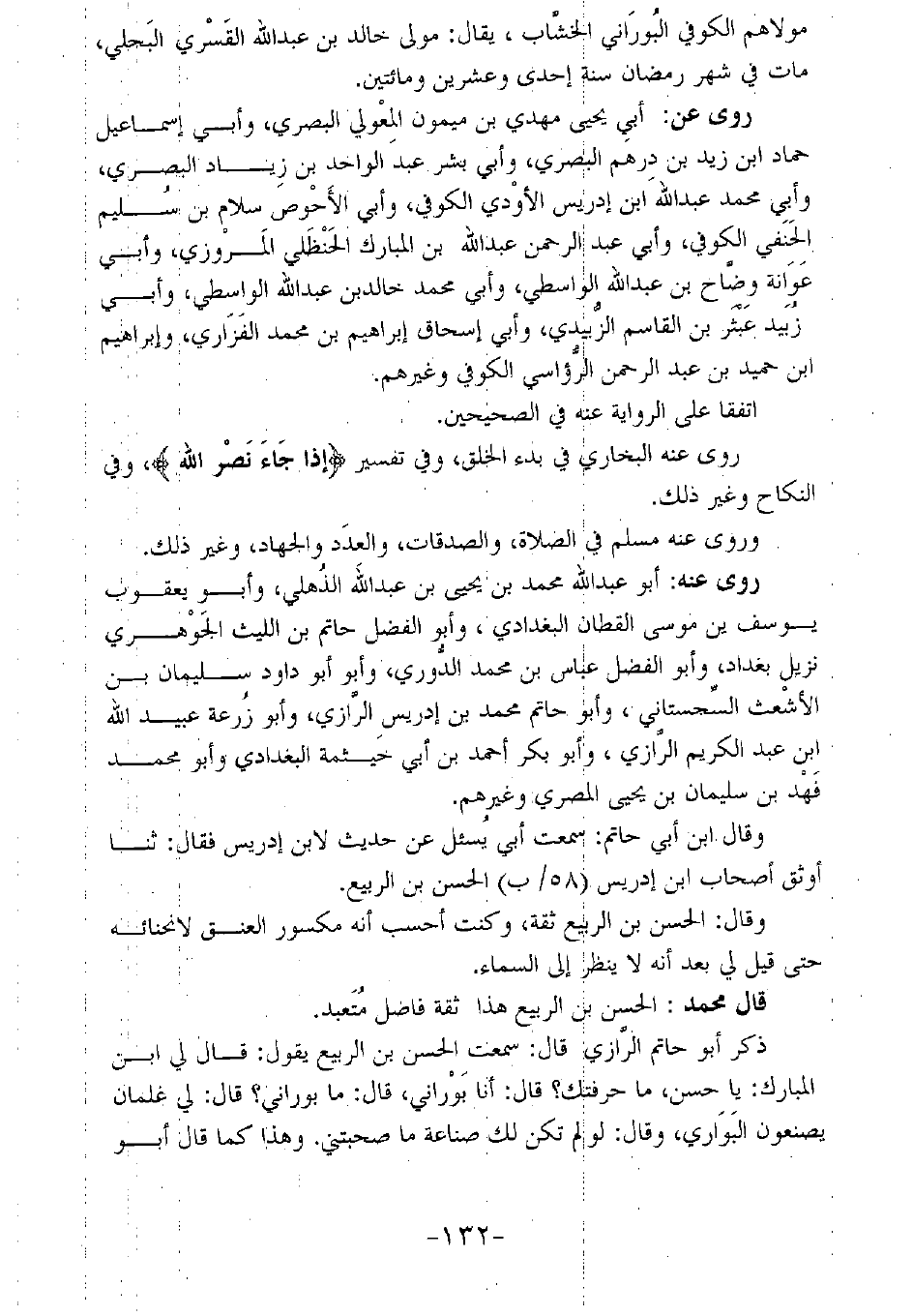 وقال: الحسن بن الربيع ثقة، وكنت أحسب أنه مكسور العنق لانحنائه حتى قيل لي بعد أنه لا ينظر إلى السماء.