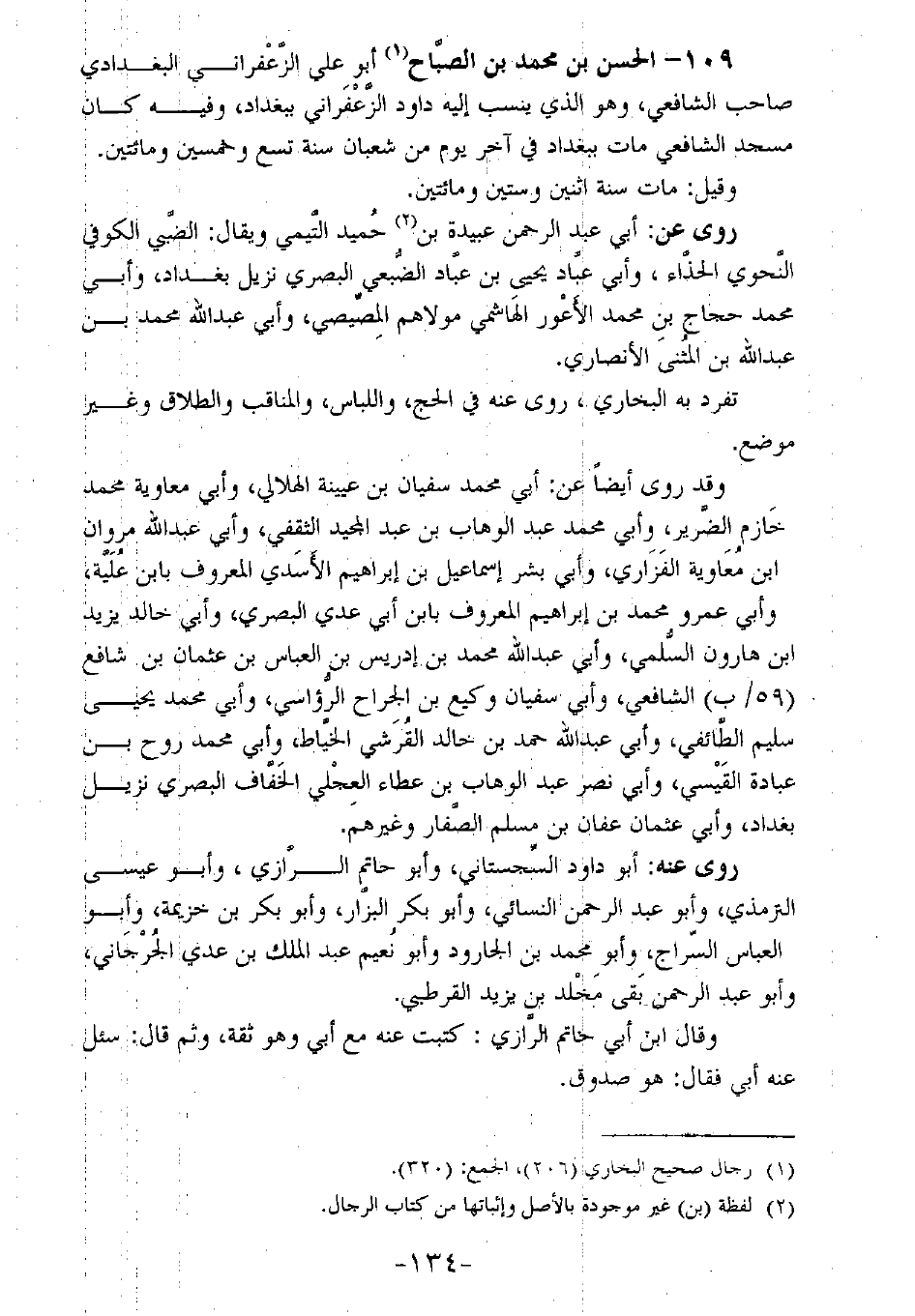 109 - الحسن بن محمد بن الصباح أبو علي الزعفراني البغدادي صاحب الشافعي، وهو الذي ينسب إليه داود الزعفراني ببغداد، وفيه كان مسجد الشافعي مات ببغداد في آخر يوم من شعبان سنة تسع وخمسين ومائتين.