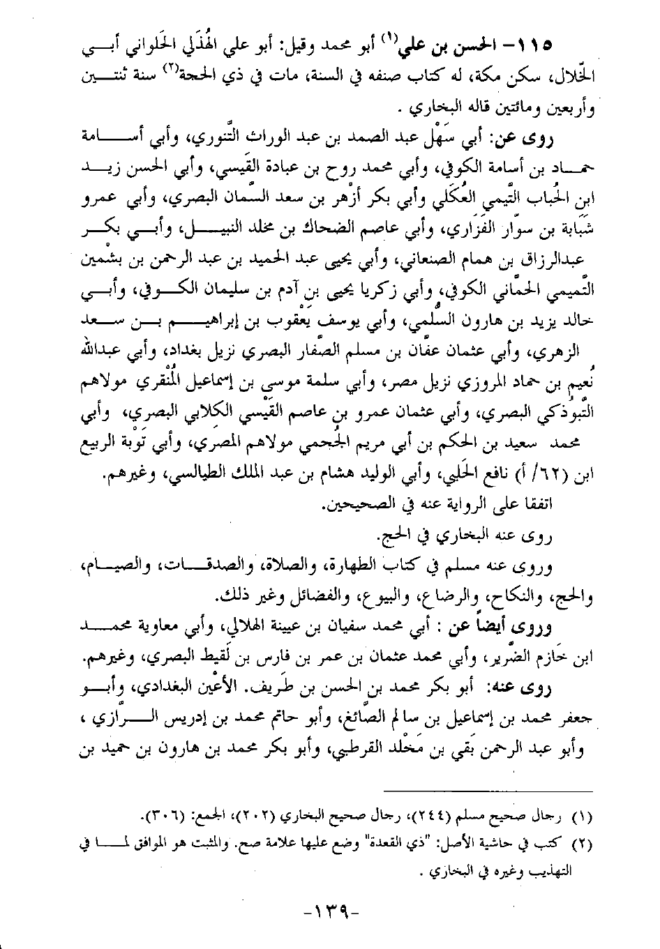 115 - الحسن بن علي أبو محمد وقيل: أبو علي الهُذلي الحلواني أبي الخلال، سكن مكة، له كتاب صنفه في السنة، مات في ذي الحجة سنة ثنتين وأربعين ومائتين قاله البخاري.