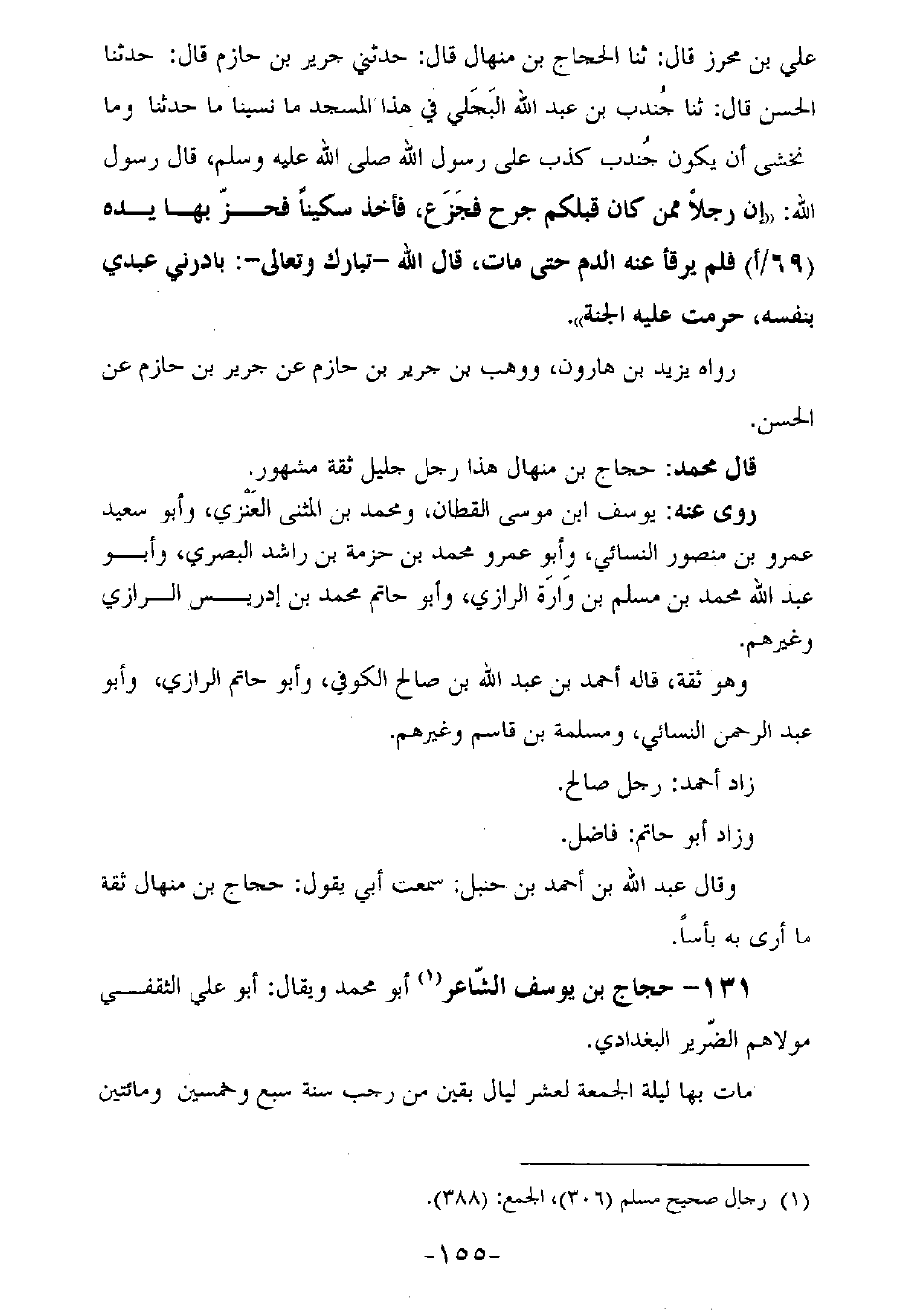 علي بن محرز قال: ثنا الحجاج بن منهال قال: حدثني جرير بن حازم قال: حدثنا الحسن قال: ثنا جندب بن عبد الله البجلي في هذا المسجد ما نسينا ما حدثنا وما نخشى أن يكون جُندب كذب على رسول الله صلى الله عليه وسلم، قال رسول الله: "إن رجلاً ممن كان قبلكم جرح فجزع، فأخذ سكينًا فحز بها يده فلم يرقأ عنه الدم حتى مات، قال الله ـ تبارك وتعالى ـ: بادرني عبدي بنفسه، حرمت عليه الجنة".