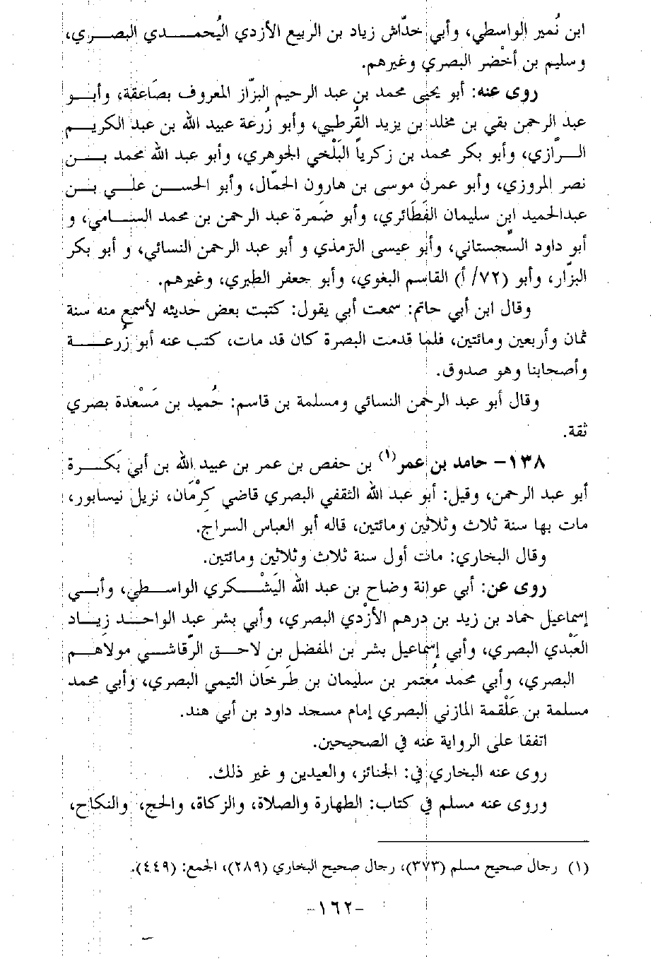 138 - حامد بن عمر بن حفص بن عمر بن عبيد الله بن أبي بكرة أبو عبد الرحمن، وقيل: أبو عبد الله الثقفي البصري قاضي كرمان، نزيل نيسابور، مات بها سنة ثلاث وثلاثين ومائتين، قاله أبو العباس السراج.
