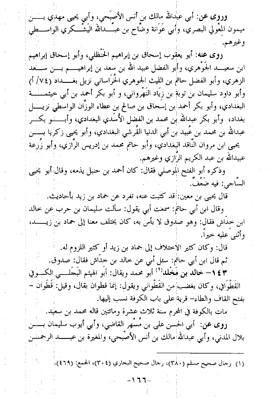 143 - خالد بن مخلد أبو محمد ويقال: أبو الهيثم البجلي الكوفي القطوافي، وكان يغضب من القطواني ويقول: إنما قطوان بقال، وقيل: قطوان ـ بفتح القاف والطاء ـ قرية على باب الكوفة نسب إليها.