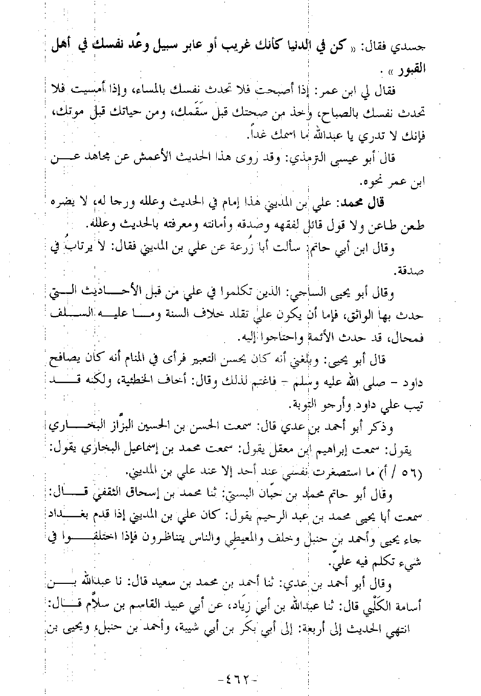 قال محمد: علي بن المديني هذا إمام في الحديث وعلله ورجا له، لا يضره طعن طاعن ولا قول قائل لفقهه وصدقه وأمانته ومعرفته بالحديث وعلله.