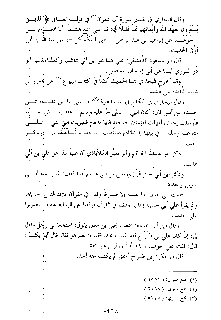 وقال البخاري في تفسير سورة آل عمران في قوله تعالى (الذين يشترون بعهد الله وايمانهم ثمنًا قليلا): ثنا علي سمع هشيمًا: أنا العوام بن حوشب، عن إبراهيم بن عبد الرحمن ـ يعني السكسكي ـ، عن عبد الله بن أبي أوفي الحديث.