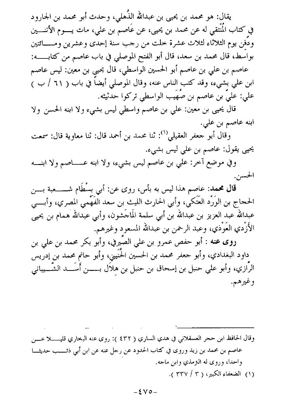 قال محمد: عاصم هذا ليس به بأس، روى عن: أبي بسطام شعبة بن الحجاج بن الورد العتكي، وأبي الحارث الليث بن سعد الفهمي المصري، وأبي عبد الله عبد العزيز بن عبد الله بن أبي سلمة الماجشون، وأبي عبد الله همام بن يحيى الأزدي العوذي، وعبد الرحمن بن عبد الله المسعود وغيرهم.