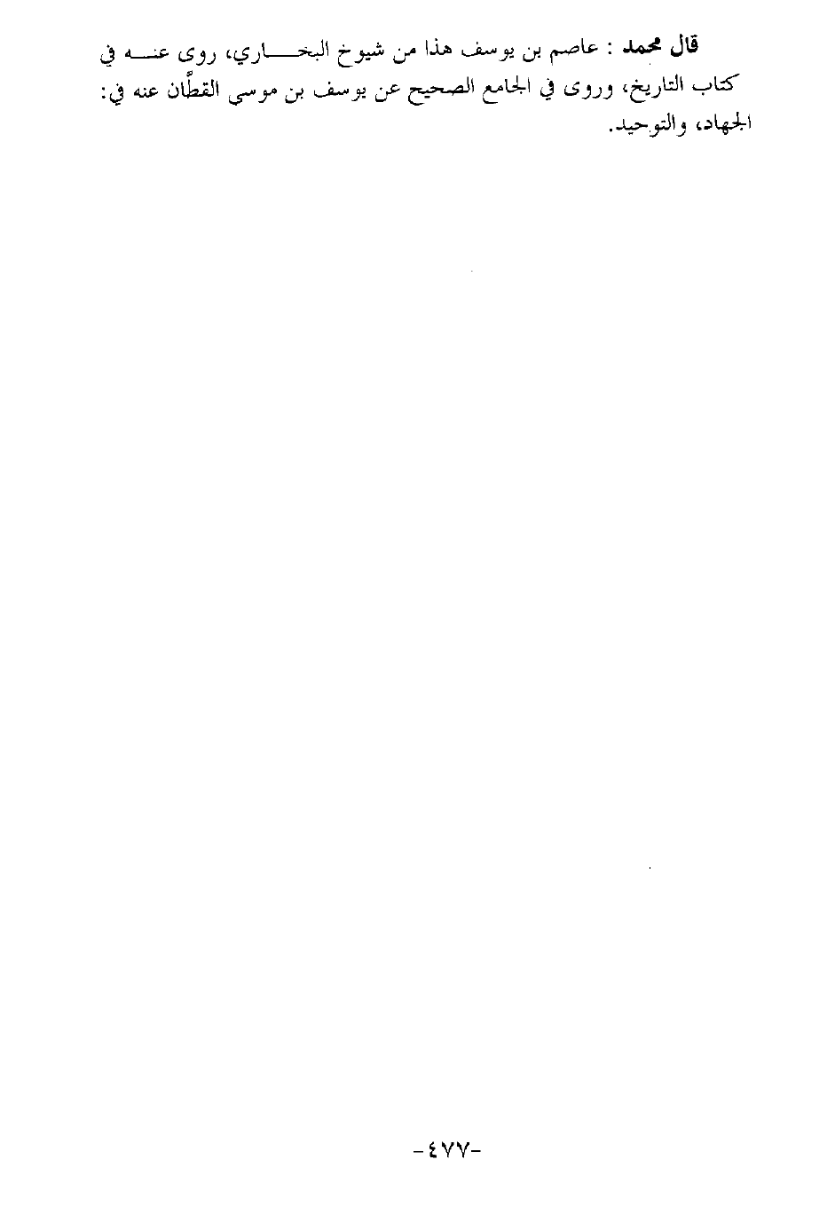 قال محمد: عاصم بن يوسف هذا من شيوخ البخاري، روى عنه في كتاب التاريخ، وروى في الجامع الصحيح عن يوسف بن موسى القطان عنه في: الجهاد، والتوحيد.