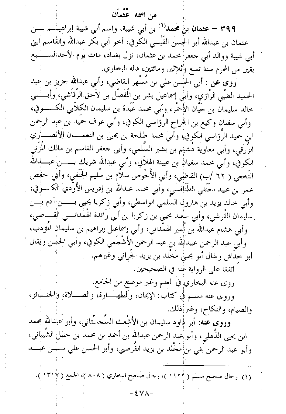 399 - عثمان بن محمد بن أبي شيبة، واسم أبي شيبة إبراهيم بن عثمان بن عبد الله أبو الحسن القيسي الكوفي، أخو أبي بكر عبد الله والقاسم البني أبي شيبة ووالد أبي جعفر محمد بن عثمان، نزل بغداد، مات يوم الأحد لسبع بقين من المحرم سنة تسع وثلاثين ومائتين، قاله البخاري.