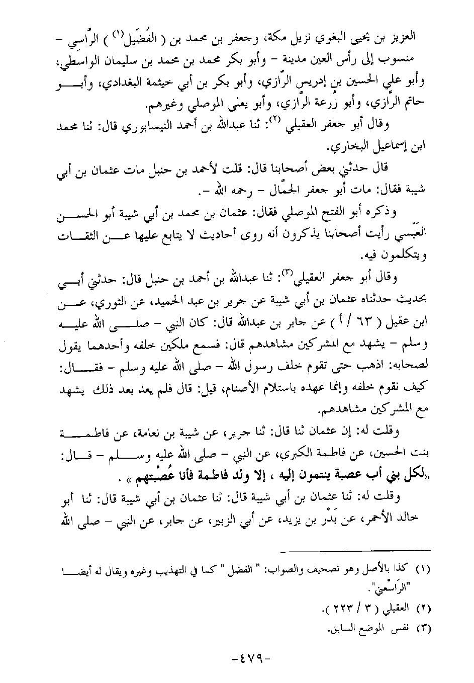 وقلت له: إن عثمان ثنا قال: ثنا جرير، عن شيبة بن نعامة، عن فاطمة بنت الحسين، عن فاطمة الكبرى، عن النبي ـ صلى الله عليه وسلم ـ قال: "لكل بني أب عصبة ينتمون إليه، إلا ولد فاطمة فأنا عصبتهم".