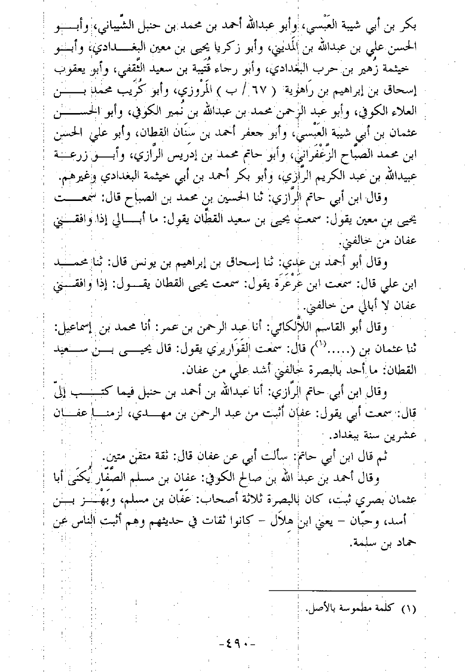 وقال أحمد بن عبد الله بن صالح الكوفي: عفان بن مسلم الصفار يكني أبا عثمان بصري ثبت، كان بالبصرة ثلاثة أصحاب: عفان بن مسلم، وبهز بن أسد، وحبان ـ يعني ابن هلال ـ كانوا ثقات في حديثهم وهم أثبت الناس عن حماد بن سلمة.