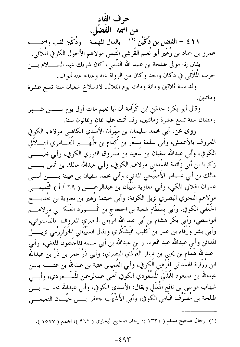 411 - الفضل بن دكين ـ بالدال المهملة ـ ودكين لقب واسمه عمرو بن حماد بن زهير أبو نعيم القرشي التيمي مولاهم الأحول الكوفي الملائي.