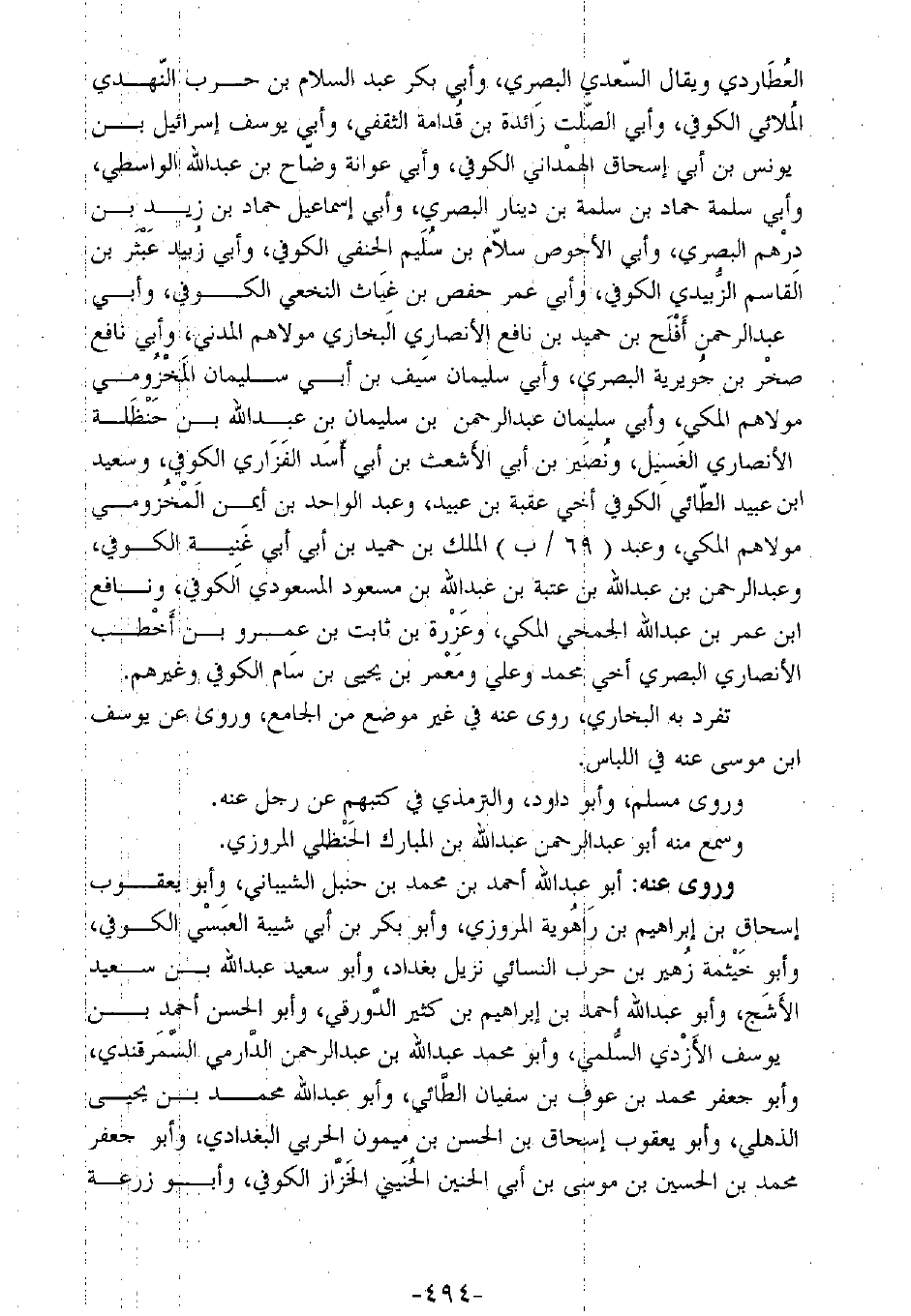 العطاردي ويقال السعدي البصري، وابي بكر عبد السلام بن حرب النهدي الملائي الكوفي، وأبي الصلت زائدة بن قدامة الثقفي، وأبي يوسف إسرائيل بن يونس بن أبي إسحاق الهمداني الكوفي، وأبي عوانة وضاح بن عبد الله الواسطي، وأبي سلمة حماد بن سلمة بن دينار البصري، وأبي إسماعيل حماد بن زيد بن درهم البصري، وأبي الأحوص سلام بن سليم الحنفي الكوفي، وأبي زبيد عبثر بن القاسم الزبيدي الكوفي، وأبي عمر حفص بن غياث النخعي الكوفي، وابي عبد الرحمن أفلح بن حميد بن نافع الأنصاري البخاري مولاهم المدني، وأبي نافع صخر بن جويرية البصري، وابي سليمان سيف بن أبي سليمان المخزومي مولاهم المكي، وأبي سليمان عبد الرحمن بن سليمان بن عبد الله بن حنظلة الأنصاري الغسيل، ونصير بن أبي الأشعث بن أبي أسد الزاري الكوفي، وسعيد ابن عبيد الطائي الكوفي أخي عقبة بن عبيد، وعبد الواحد بن أيمن المخزومي مولاهم المكي، وعبد الملك بن حميد بن أبي أبي غنيمة الكوفي، وعبد الرحمن بن عبد الله بن عتبة بن عبد الله بن مسعود المسعودي الكوفي، ونافع ابن عمر بن عبد الله الجمحي المكي، وعزرة بن ثابت بن عمرو بن أخطب الأنصاري البصري أخي محمد وعلي ومعمر بن يحيى بن سام الكوفي وغيرهم.