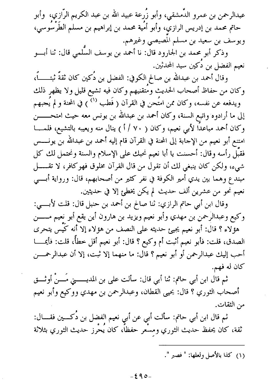 ثم قال ابن أبي حاتم: سألت أبي عن أبي نعيم الفضل بن دكين فقال: ثقة، كان يحفظ حديث الثوري ومسعر حفظًا، كان يحرز حديث الثوري بثلاثة