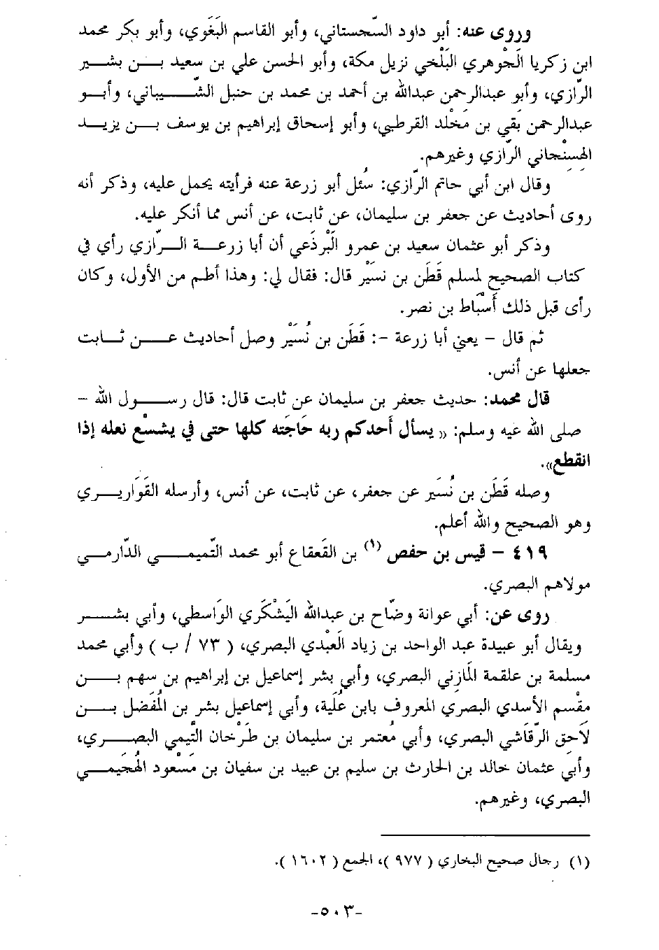 قال محمد: حديث جعفر بن سليمان عن ثابت قال: قال رسول الله ـ صلى الله عليه وسلم ـ: "يسأل أحدكم ربه حاجته كلها حتى في يشسع نعلهإذا انقطع".