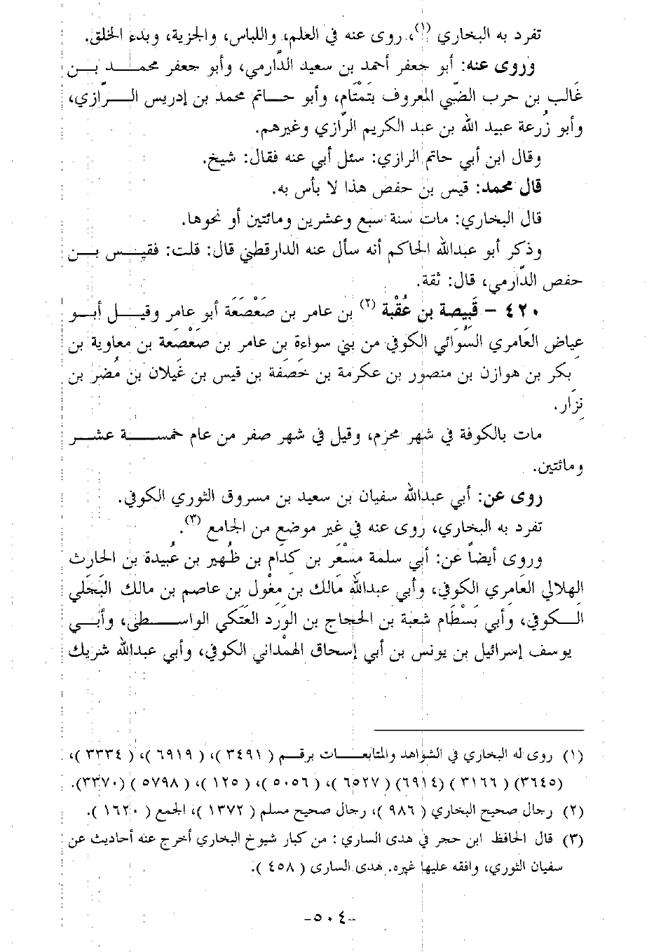 420 - قبيصة بن عقبة بن عامر بن صعصعة أبو عامر وقيل أبو عياض العامري السوائي الكوفي من بني سواءة بن عامر بن صعصعة بن معاوية بن بكر بن هوزان بن منصور بن عكرة بن خصفة بن قيس بن غيلان بن مضر بن نزار.