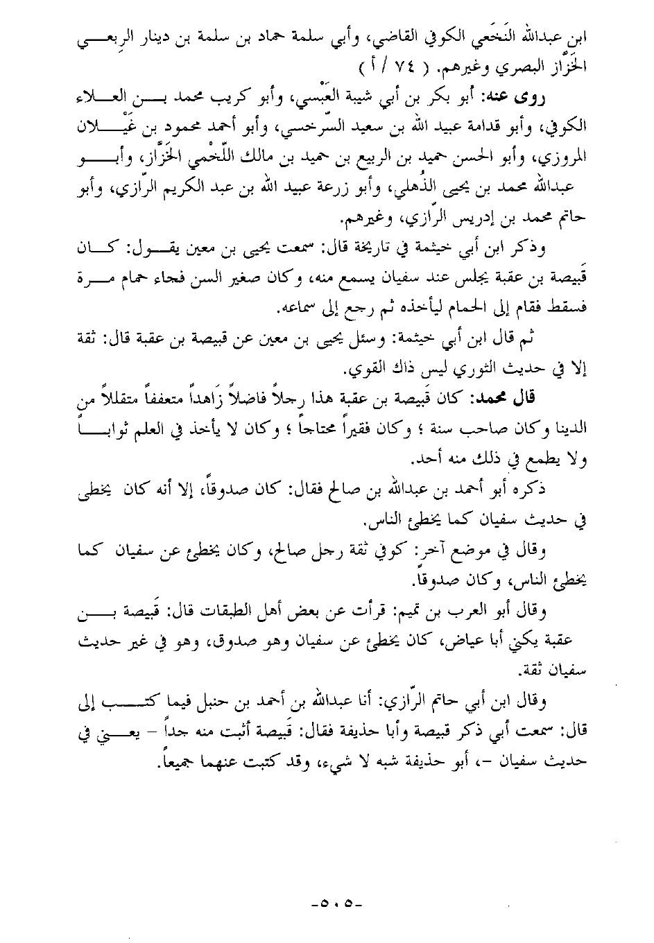 قال محمد: كان قبيصة بن عقبة هذا رجلاً فاضلاً زاهدًا متعففًا متقللاً من الدنيا وكان صاحب سنة؛ وكان فقيرًا محتاجًا؛ وكان لا يأخذ في العلم ثوابًا ولا يطمع في ذلك منه أحد.