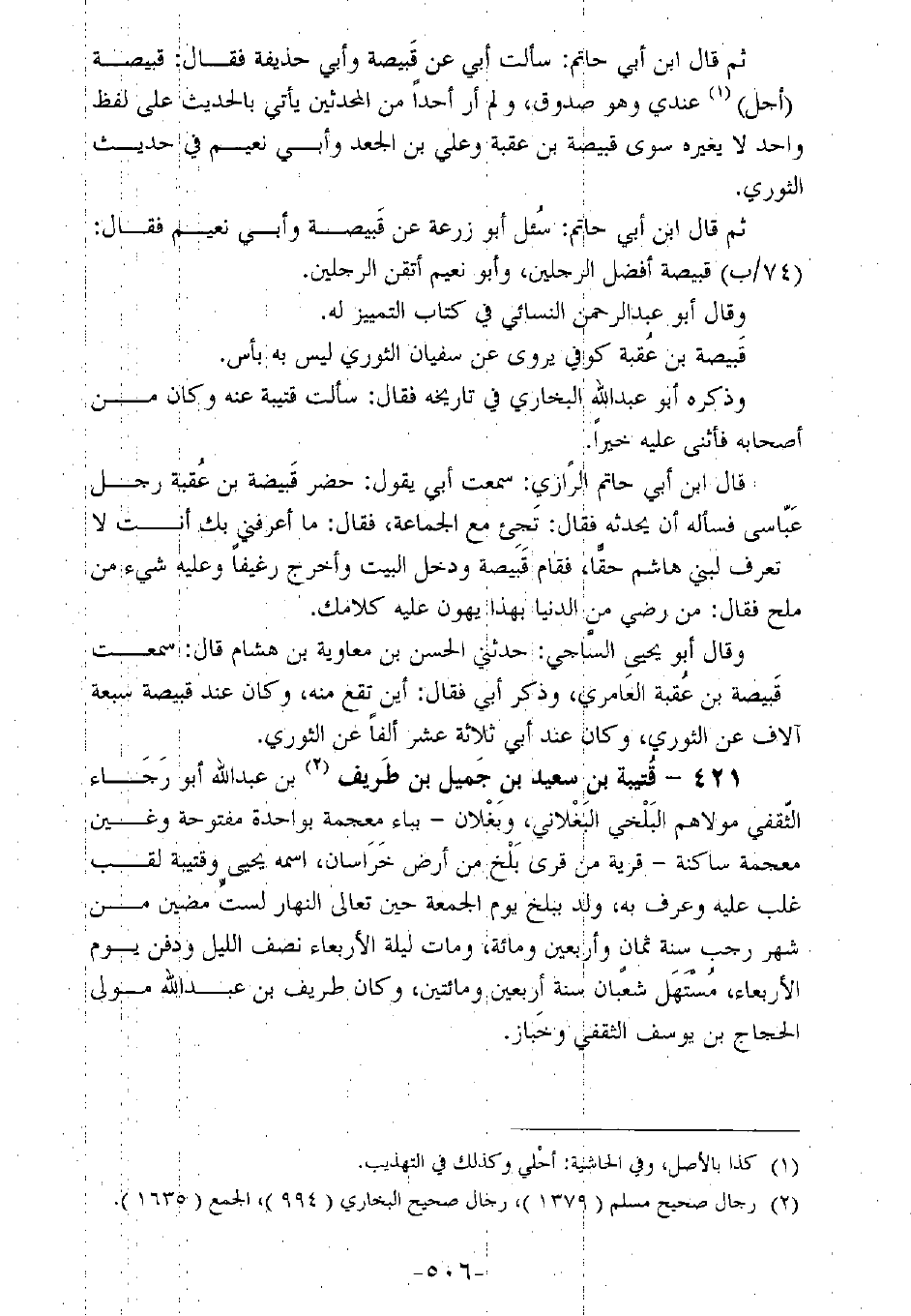 421 - قتيبة بن سعيد بن جميل بن طريف بن عبد الله أبو رجاء الثقفي مولاهم البلخي البغلاني، وبغلان ـ بباء معجمة بواحدة مفتوحة وغين معجمة ساكنة ـ قرية من قرى بلخ من أرض خراسان، اسمه يحيى وقتيبة لقب غلب عليه وعرف به، ولد ببلخ يوم الجمعة حين تعالى النهار لست مضين من شهر رجب سنة ثمان وأربعين ومائة، ومات ليلة الأربعاء نصف الليل ودفن يوم الأربعاء، مستهل شعبان سنة أريعين ومائتين، وكان طريف بن عبد الله مولى الحجاج بن يوسف الثقفي وخباز.