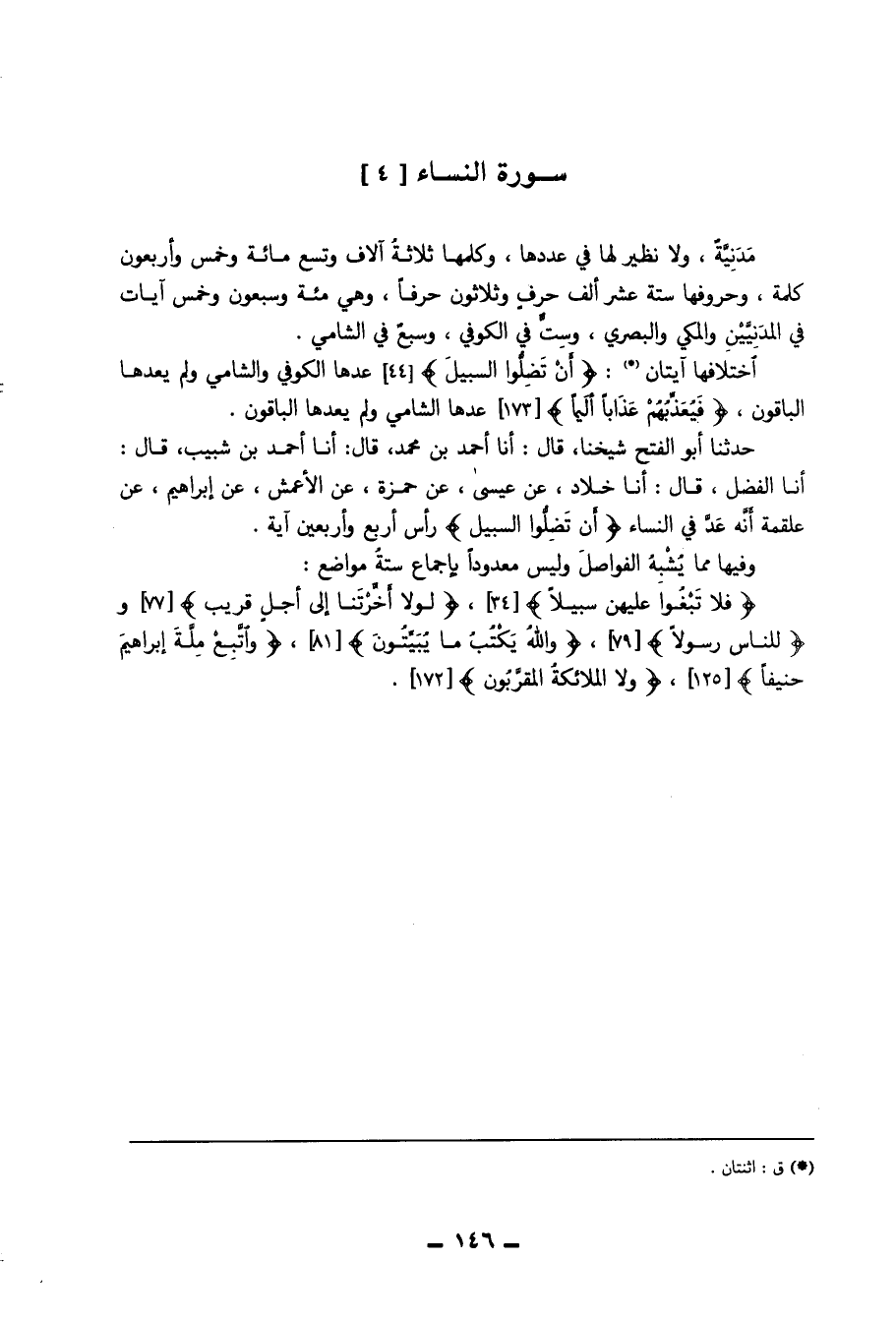 حَدثنَا أَبُو الْفَتْح شَيخنَا قَالَ أَنا أَحْمد بن مُحَمَّد قَالَ أَنا أَحْمد بن شبيب قَالَ أَنا الْفضل قَالَ أَنا خَلاد عَن عِيسَى عَن حَمْزَة عَن الْأَعْمَش عَن إِبْرَاهِيم عَن عَلْقَمَة أَنه عد فِي النِّسَاء ( {أَن تضلوا السَّبِيل} ) رَأس أَربع وَأَرْبَعين آيَة