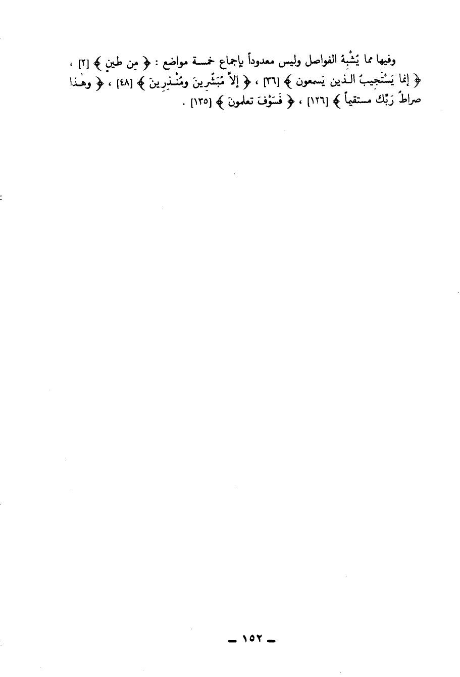 وفيهَا مِمَّا يشبه الفواصل وَلَيْسَ معدودا بِإِجْمَاع خَمْسَة مَوَاضِع ( {من طين} إِنَّمَا يستجيب الَّذين يسمعُونَ) ( {إِلَّا مبشرين ومنذرين} وَهَذَا صِرَاط رَبك مُسْتَقِيمًا) ( {فَسَوف تعلمُونَ}