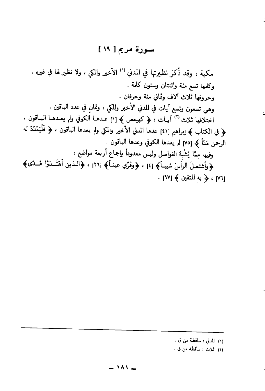 اختلافها ثَلَاث آيَات ( {كهيعص} ) عدهَا الْكُوفِي وَلم يعدها الْبَاقُونَ ( {فِي الْكتاب} ) إِبْرَاهِيم عدهَا الْمدنِي الْأَخير والمكي وَلم يعدها الْبَاقُونَ ( {فليمدد لَهُ الرَّحْمَن مدا} ) لم يعدها الْكُوفِي وعدها الْبَاقُونَ