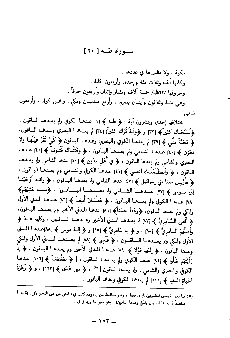 اختلافها إِحْدَى وَعِشْرُونَ آيَة ( {طه} ) عدهَا الْكُوفِي وَلم يعدها الْبَاقُونَ ( {نسبحك كثيرا} ) و ( {ونذكرك كثيرا} ) لم يعدهما الْبَصْرِيّ وعدهما الْبَاقُونَ ( {محبَّة مني} ) لم يعدها الْكُوفِي والبصري وعدها الْبَاقُونَ ( {كي تقر عينهَا وَلَا تحزن} ) عدهَا الشَّامي وَلم يعدها الْبَاقُونَ ( {وَفَتَنَّاك فُتُونًا} ) عدهَا الْبَصْرِيّ والشامي وَلم يعدها الْبَاقُونَ ( {فِي أهل مَدين} ) عدهَا الشَّامي وَلم يعدها الْبَاقُونَ ( {واصطنعتك لنَفْسي} ) عدهَا الْكُوفِي والشامي وَلم يعدها الْبَاقُونَ ( {فَأرْسل مَعنا بني إِسْرَائِيل} ) عدهَا والشامي وَلم يعدها الْبَاقُونَ ( {وَلَقَد أَوْحَينَا إِلَى مُوسَى} ) عدهَا الشَّامي وَلم يعدها الْبَاقُونَ ( {مَا غشيهم} ) عدهَا الْكُوفِي وَلم يعدها الْبَاقُونَ ( {غَضْبَان أسفا} ) عدهَا الْمدنِي الأول والمكي وَلم يعدها الْبَاقُونَ ( {وَعدا حسنا} ) عدهَا الْمدنِي الْأَخير وَلم يعدها الْبَاقُونَ ( {ألْقى السامري} ) لم يعدها الْمدنِي الْأَخير وعدها الْبَاقُونَ وَكلهمْ عد ( {وأضلهم السامري} ) و ( {يَا سامري} ) و ( {إِلَه مُوسَى} ) عدهَا الْمدنِي الأول والمكي وَلم يعدها الْبَاقُونَ ( {فنسي} ) لم يعدها الْمدنِي الأول والمكي وعدها الْبَاقُونَ ( {إِلَيْهِم قولا} ) عدهَا الْمدنِي الْأَخير وَلم يعدها الْبَاقُونَ ( {إِذْ رَأَيْتهمْ ضلوا} ) عدهَا الْكُوفِي وَلم يعدها الْبَاقُونَ ( {صفصفا} ) عدهَا الْكُوفِي والبصري والشامي وَلم يعدها الْبَاقُونَ ( {مني هدى} ) و ( {زهرَة الْحَيَاة الدُّنْيَا} ) لم يعدهما الْكُوفِي وعدهما الْبَاقُونَ