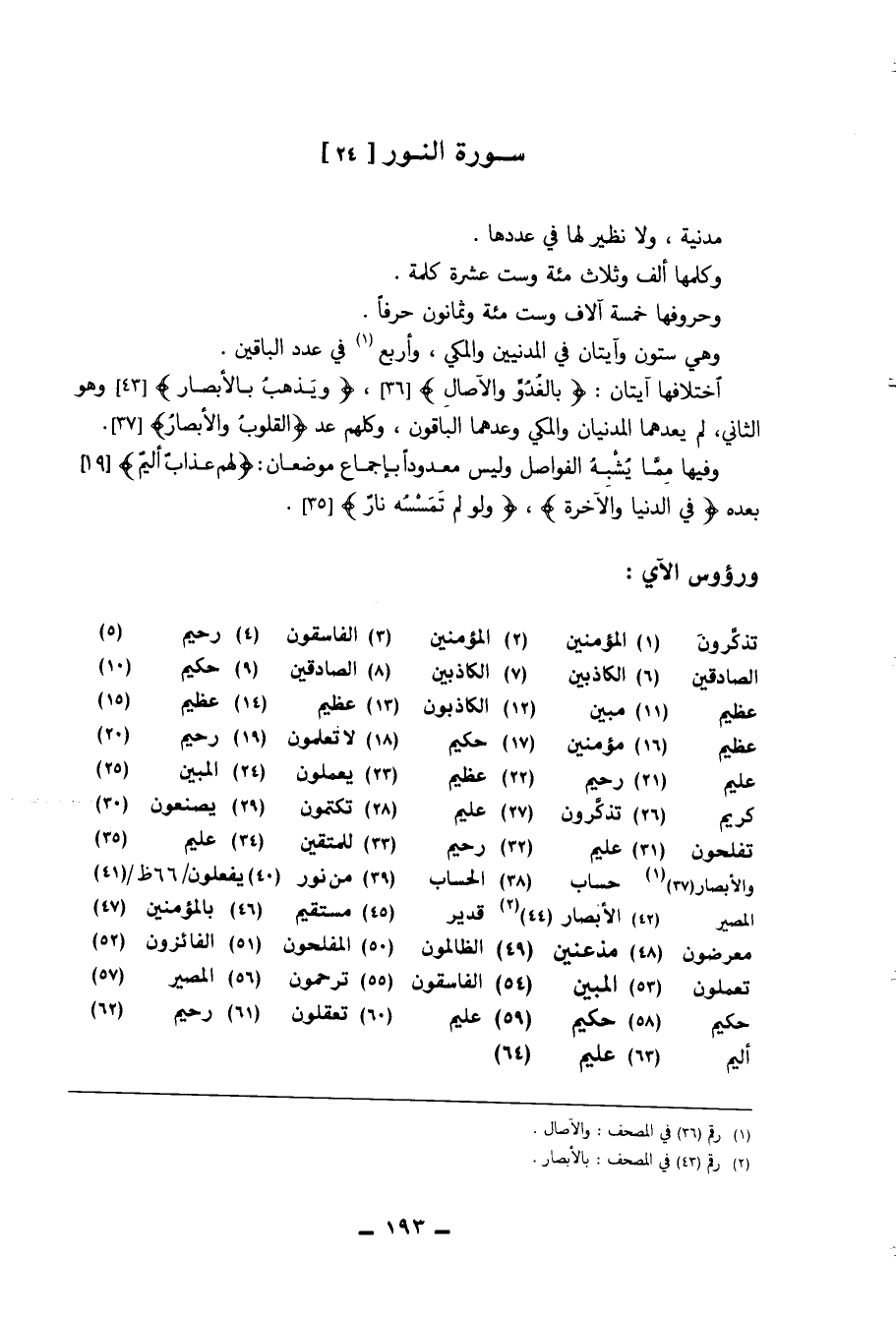 اختلافها آيتان ( {بِالْغُدُوِّ وَالْآصَال} وَيذْهب بالأبصار) وَهُوَ الثَّانِي لم يعدهما المدنيان والمكي وعدهما الْبَاقُونَ وَكلهمْ عد ( {الْقُلُوب والأبصار} )