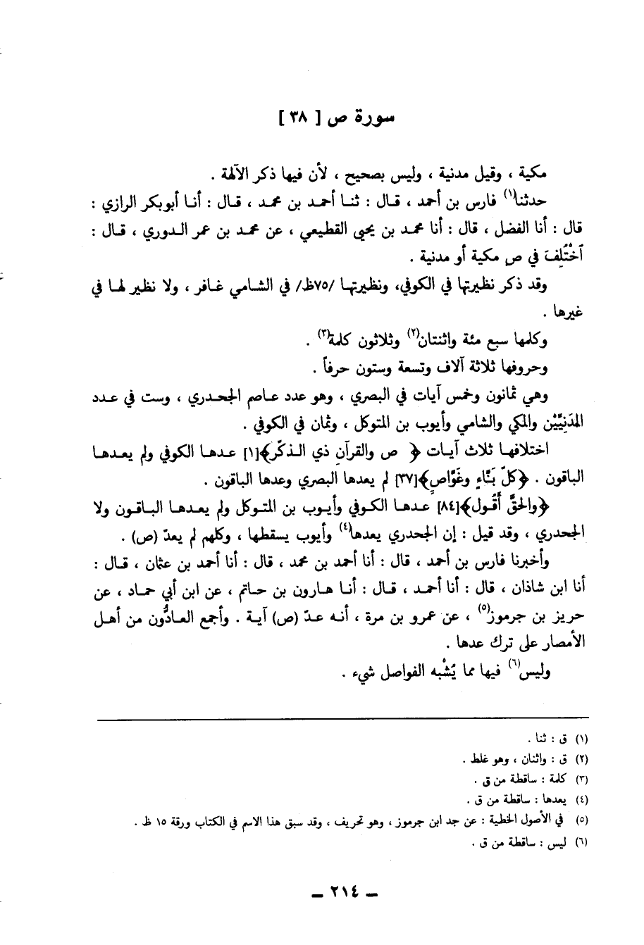 وَأخْبرنَا فَارس بن أَحْمد قَالَ أَنا أَحْمد بن مُحَمَّد قَالَ أَنا أَحْمد بن عُثْمَان قَالَ أَنا ابْن شَاذان قَالَ أَنا أَحْمد قَالَ أَنا هَارُون بن حَاتِم عَن ابْن أبي حَمَّاد عَن حريز بن جرموز عَن عَمْرو بن مرّة أَنه عد ص آيَة وَأجْمع العادون من أهل الْأَمْصَار على ترك عدهَا