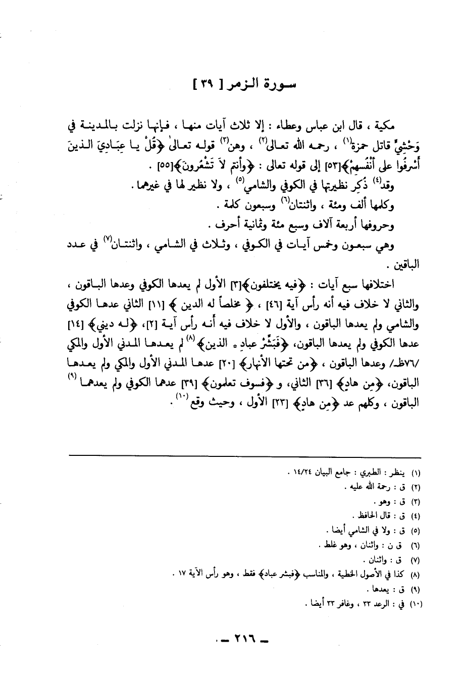 اختلافها سبع آيَات ( {فِيهِ يَخْتَلِفُونَ} ) الأول لم يعدها الْكُوفِي وعدها الْبَاقُونَ وَالثَّانِي لَا خلاف فِيهِ أَنه رَأس آيَة ( {مخلصا لَهُ الدّين} ) الثَّانِي عدهَا الْكُوفِي والشامي وَلم يعدها الْبَاقُونَ وَالْأول لَا خلاف فِيهِ أَنه رَأس آيَة ( {لَهُ ديني} ) عدهَا الْكُوفِي وَلم يعدها الْبَاقُونَ ( {فبشر عباد الَّذين} ) لم يعدها الْمدنِي الأول والمكي وعدها الْبَاقُونَ ( {من تحتهَا الْأَنْهَار} ) عدهَا الْمدنِي الأول والمكي وَلم يعدها الْبَاقُونَ ( {من هاد} ) الثَّانِي و ( {فَسَوف تعلمُونَ} ) عدهما الْكُوفِي وَلم يعدهما الْبَاقُونَ وَكلهمْ عد ( {من هاد} ) الأول وَحَيْثُ وَقع