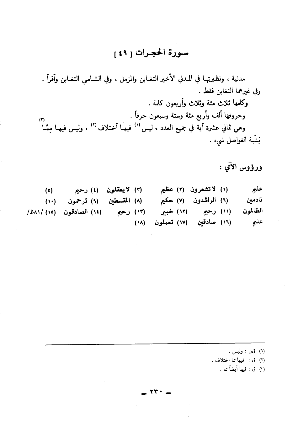وَهِي ثَمَانِي عشرَة آيَة فِي جَمِيع الْعدَد لَيْسَ فِيهَا اخْتِلَاف وَلَيْسَ فِيهَا مِمَّا يشبه الفواصل شَيْء