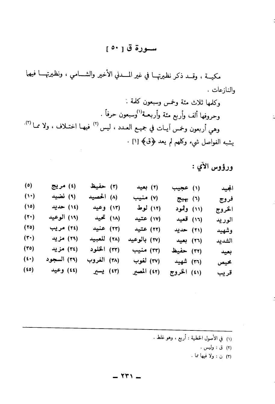وَهِي أَرْبَعُونَ وَخمْس آيَات فِي جَمِيع الْعدَد لَيْسَ فِيهَا اخْتِلَاف وَلَا مِمَّا يشبه الفواصل شَيْء وَكلهمْ لم يعد ( {ق} )