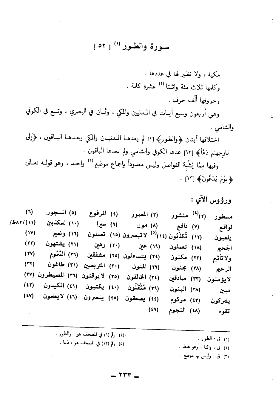 اختلافها آيتان ( {وَالطور} ) لم يعدها المدنيان والمكي وعدها الْبَاقُونَ ( {إِلَى نَار جَهَنَّم دَعَا} ) عدهَا الْكُوفِي والشامي وَلم يعدها الْبَاقُونَ