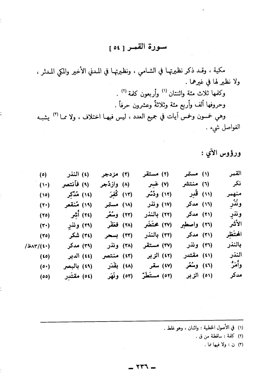 وَهِي خَمْسُونَ وَخمْس آيَات فِي جَمِيع الْعدَد لَيْسَ فِيهَا اخْتِلَاف وَلَا مِمَّا يشبه الفواصل شَيْء