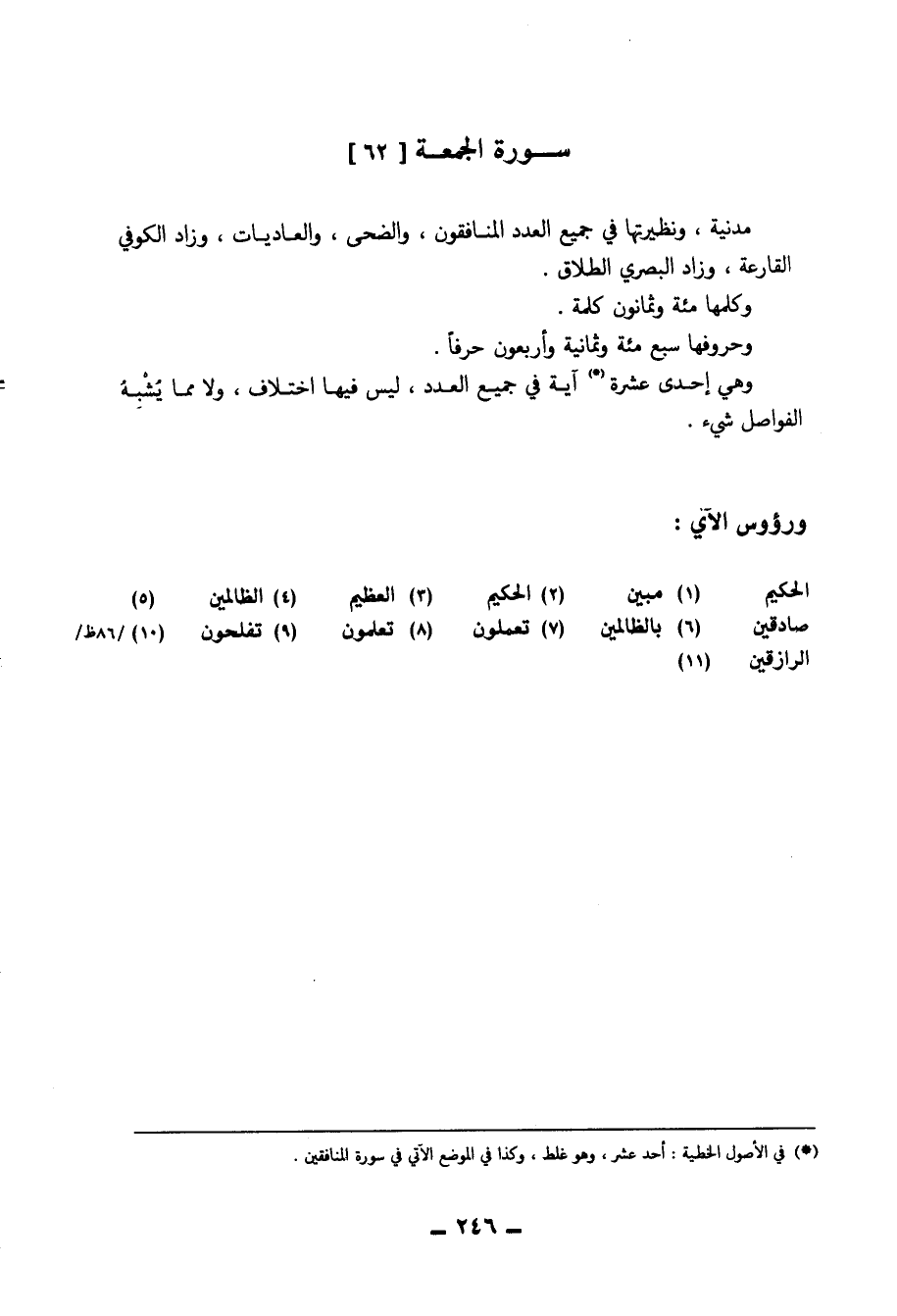وَهِي إِحْدَى عشرَة آيَة فِي جَمِيع الْعدَد لَيْسَ فِيهَا اخْتِلَاف وَلَا مِمَّا يشبه الفواصل شَيْء