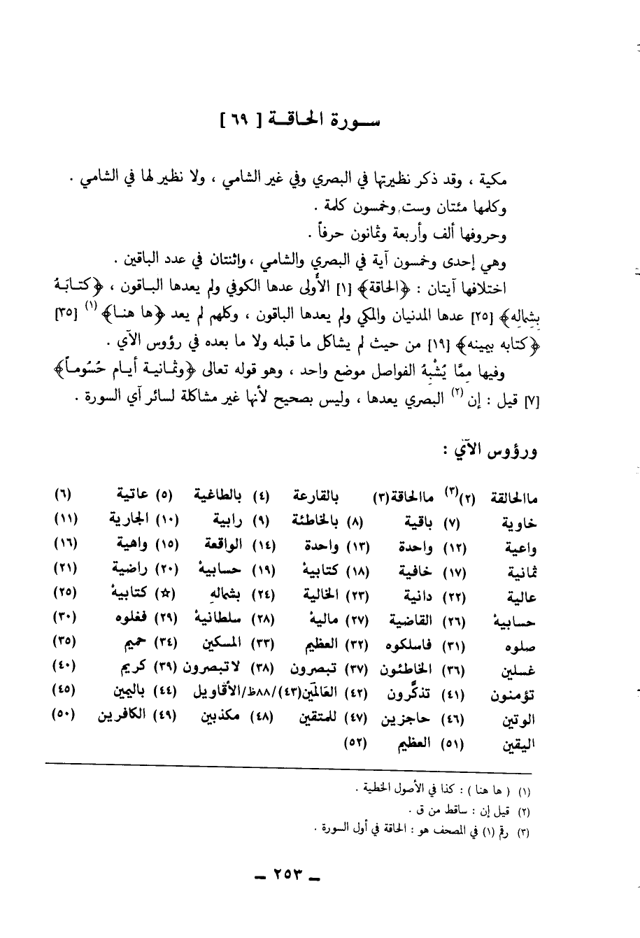 اختلافها آيتان ( {الحاقة} ) الأولى عدهَا الْكُوفِي وَلم يعدها الْبَاقُونَ ( {كِتَابه بِشمَالِهِ} ) عدهَا المدنيان والمكي وَلم يعدها الْبَاقُونَ وَكلهمْ لم يعد ( {هَا هُنَا} كِتَابه بِيَمِينِهِ) من حَيْثُ لم يشاكل مَا قبله وَلَا مَا بعده فِي رُؤُوس الْآي