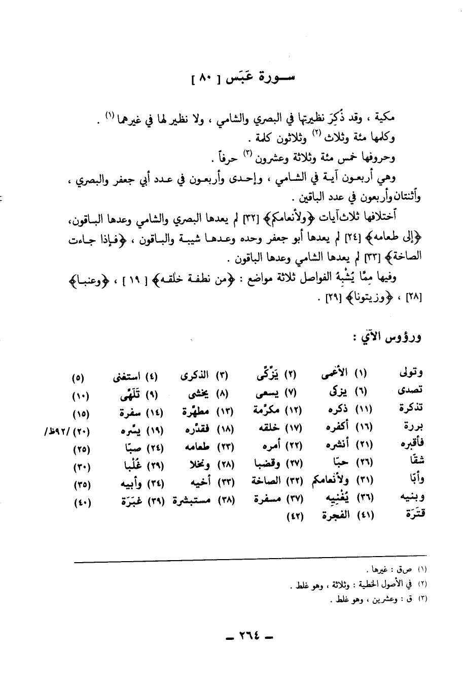 اختلافها ثَلَاث آيَات ( {ولأنعامكم} ) لم يعدها الْبَصْرِيّ والشامي وعدها الْبَاقُونَ ( {إِلَى طَعَامه} ) لم يعدها أَبُو جَعْفَر وَحده وعدها شيبَة وَالْبَاقُونَ ( {فَإِذا جَاءَت الصاخة} ) لم يعدها الشَّامي وعدها الْبَاقُونَ