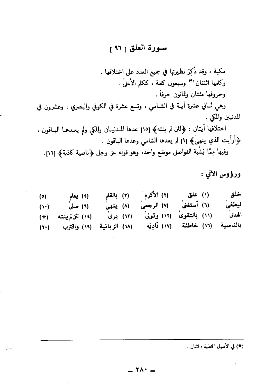 اختلافها آيتان ( {لَئِن لم ينْتَه} ) عدهَا المدنيان والمكي وَلم يعدها الْبَاقُونَ ( {أَرَأَيْت الَّذِي ينْهَى} ) لم يعدها الشَّامي وعدها الْبَاقُونَ