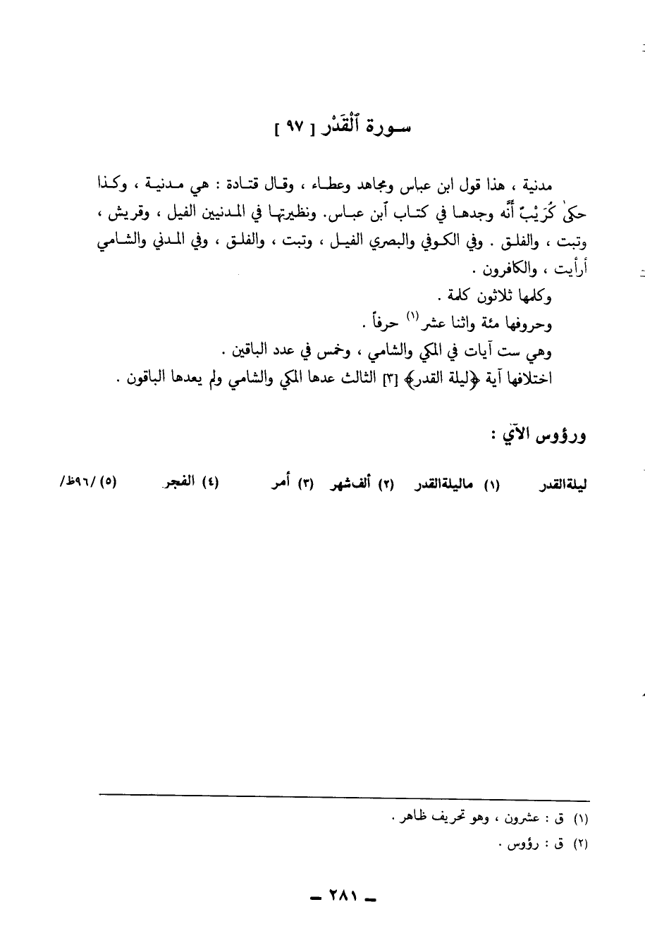 اختلافها آيَة ( {لَيْلَة الْقدر} ) الثَّالِث عدهَا الْمَكِّيّ والشامي وَلم يعدها الْبَاقُونَ