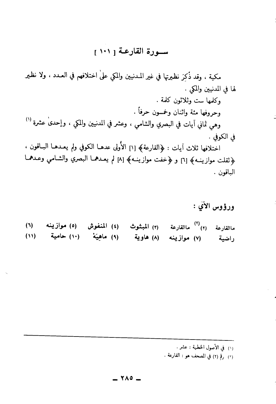 اختلافها ثَلَاث آيَات ( {القارعة} ) الأولى عدهَا الْكُوفِي وَلم يعدها الْبَاقُونَ ( {ثقلت مَوَازِينه} ) و ( {خفت مَوَازِينه} ) لم يعدهما الْبَصْرِيّ والشامي وعدهما الْبَاقُونَ